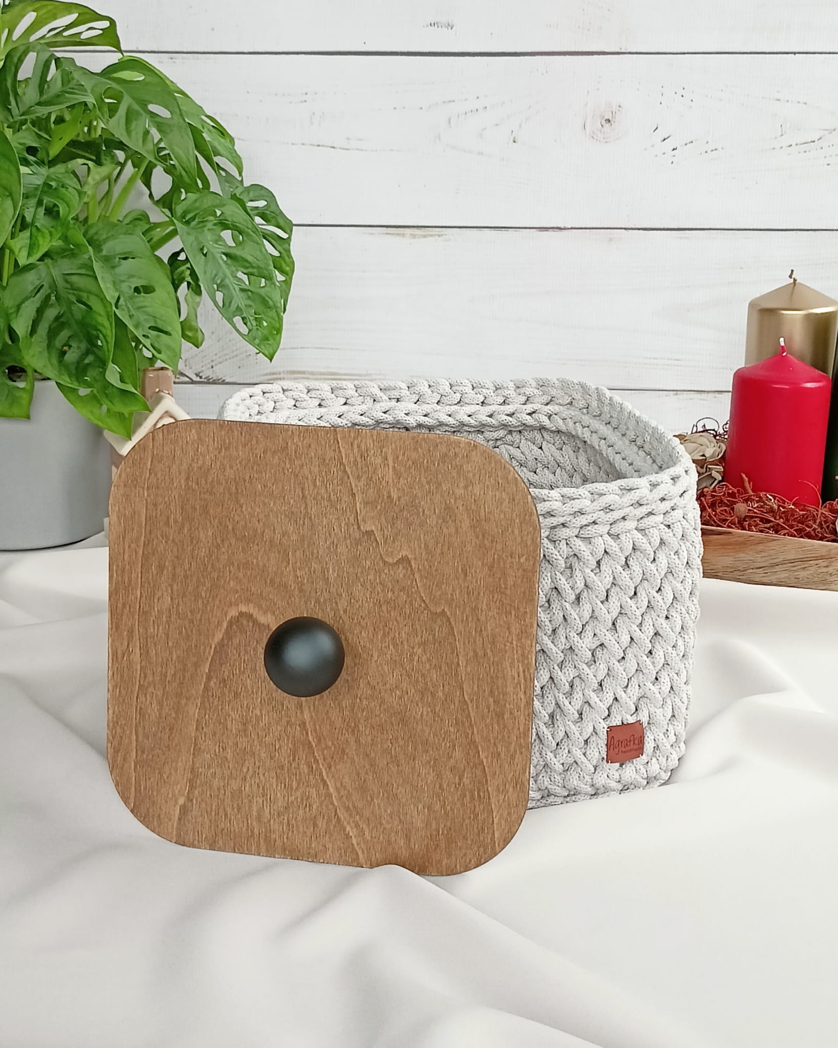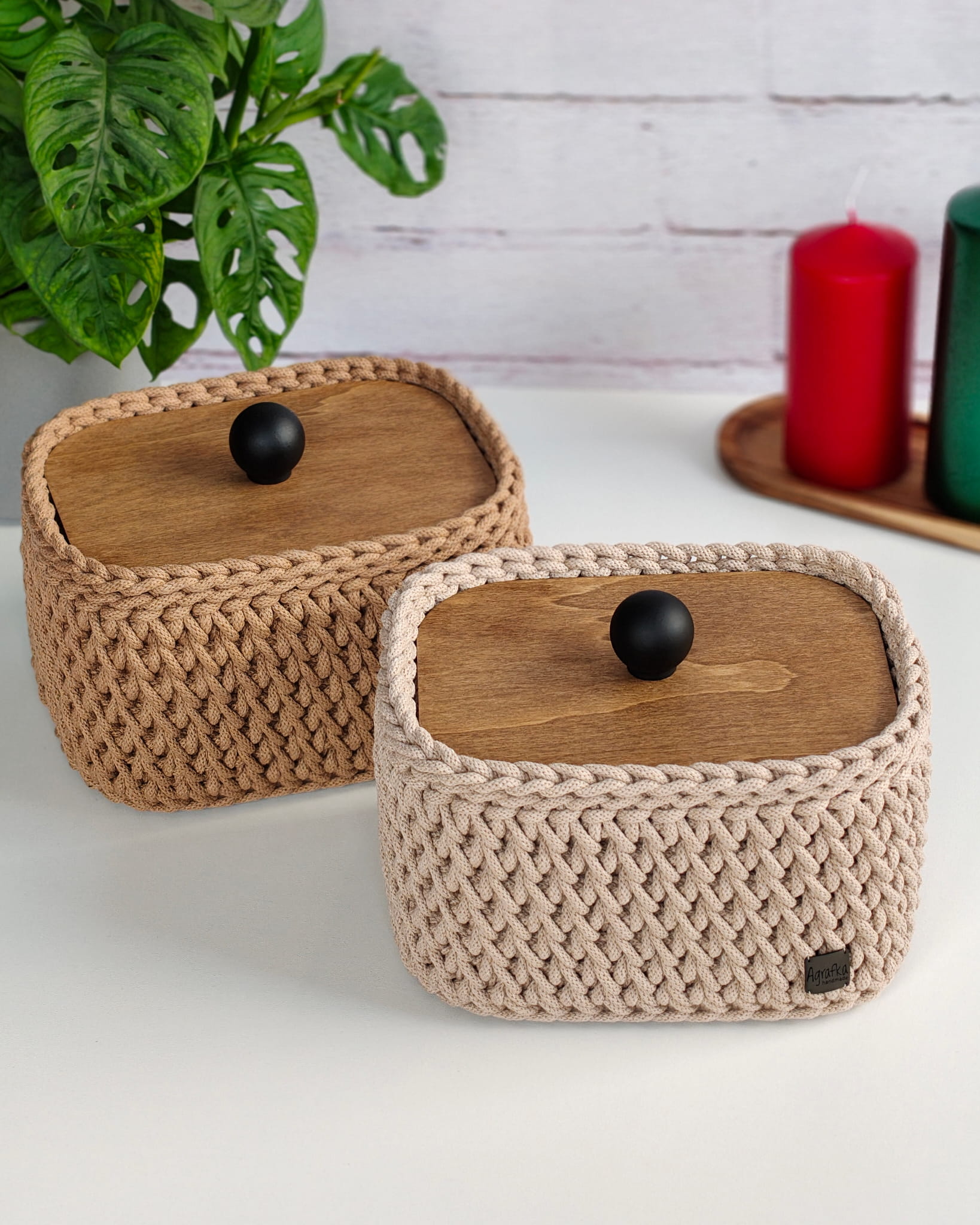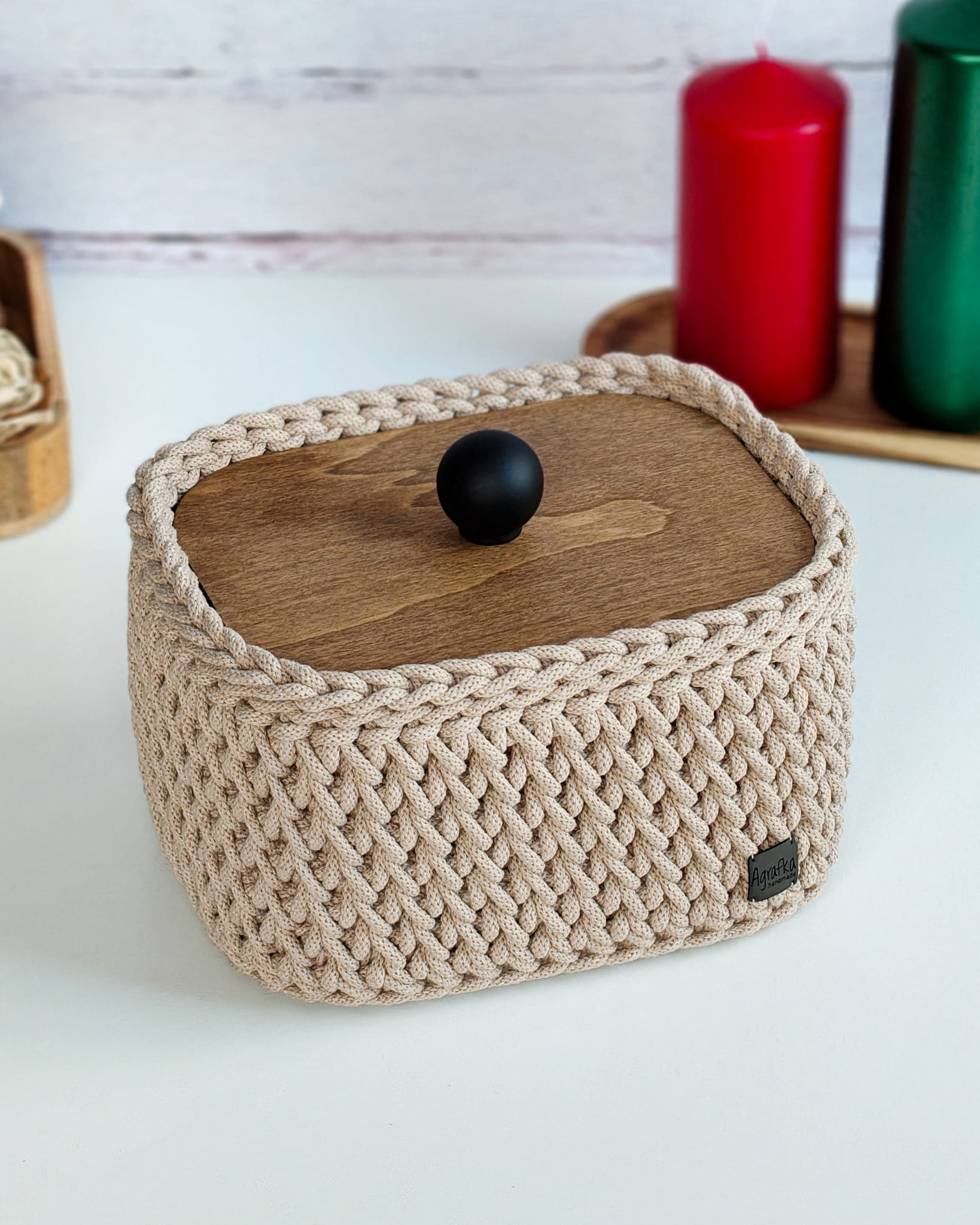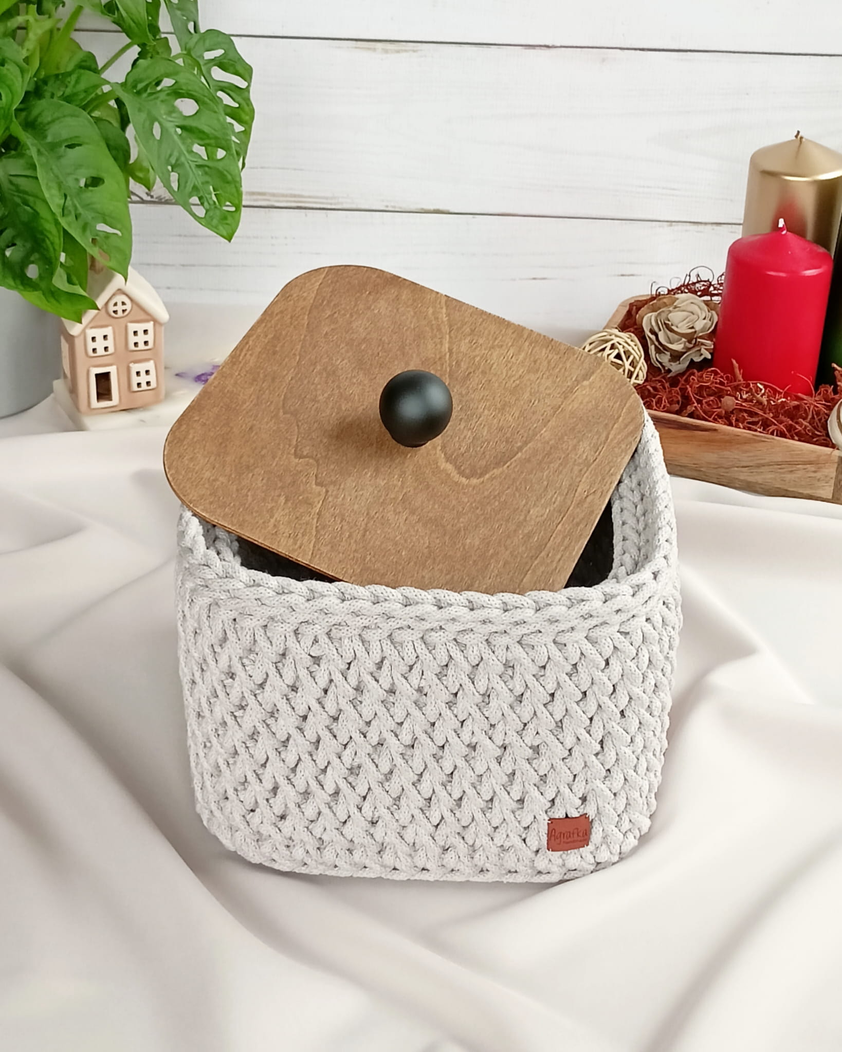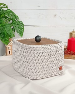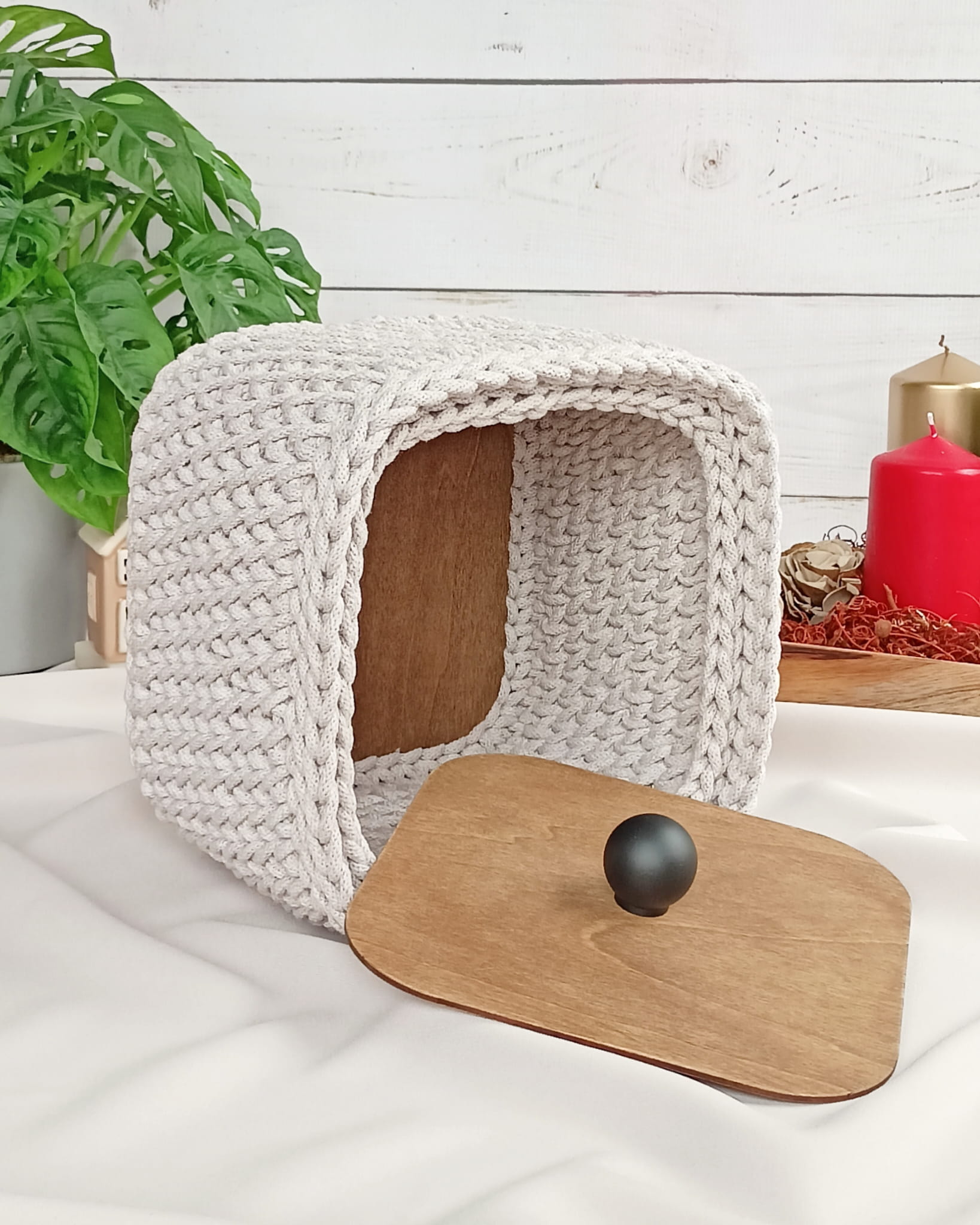 Elegancki koszyk szydełkowy z pokrywą, stworzony z bawełnianego sznurka i wykończony drewnianymi elementami. Funkcjonalny dodatek, który łączy porządek z naturalnym stylem wnętrza.