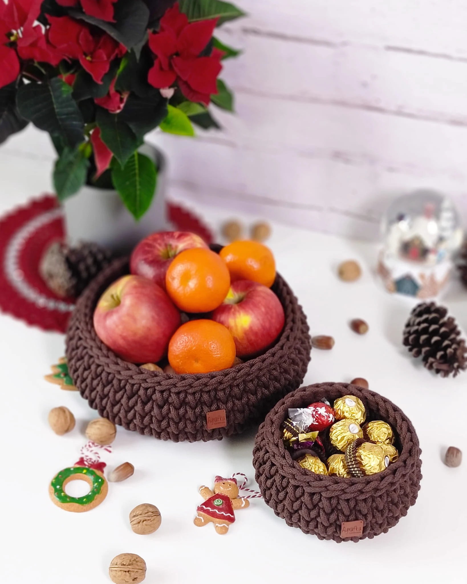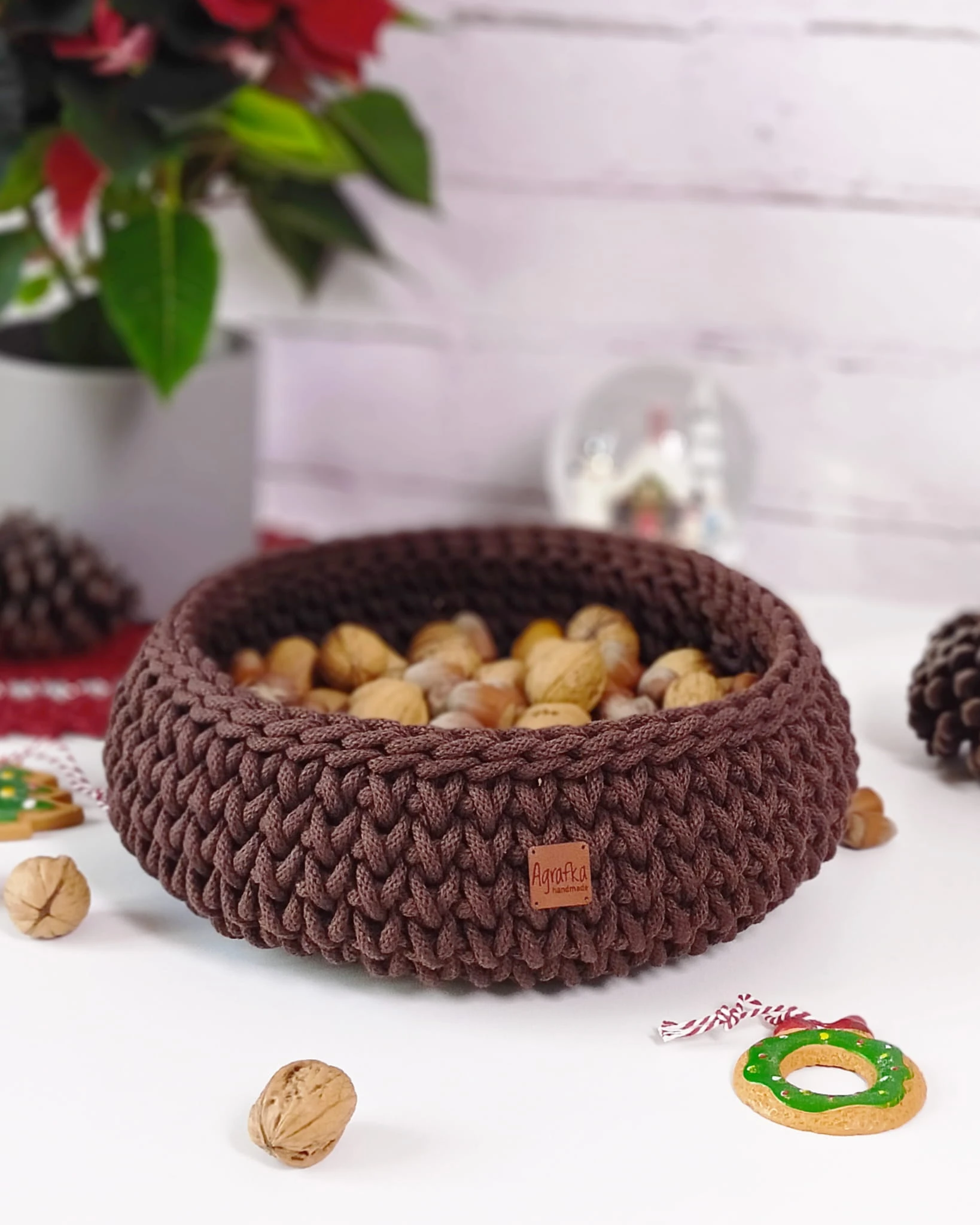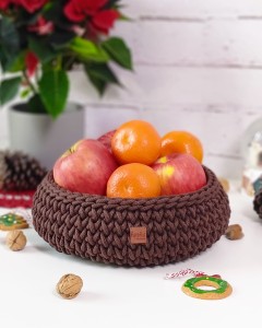Ręcznie wykonany kosz ze sznurka bawełnianego w eleganckim, czekoladowym kolorze. Idealny do przechowywania owoców, słodyczy lub jako dekoracja wnętrza.