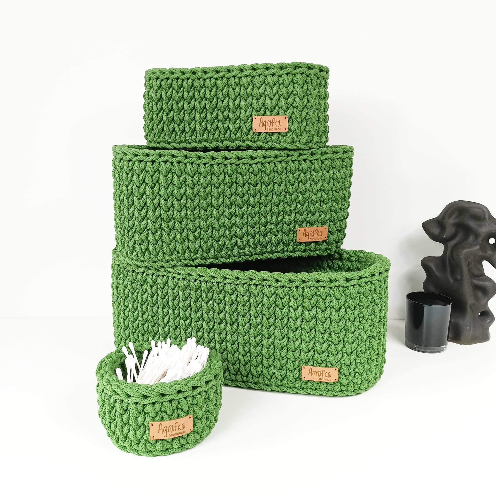Koszyki dostępne są w kilku rozmiarach, od mniejszych organizerów po większe modele o wymiarach do 35×23×15 cm. Owalny kształt ułatwia ustawienie koszyka na półkach i blatach, a jednocześnie nadaje mu dekoracyjny charakter.