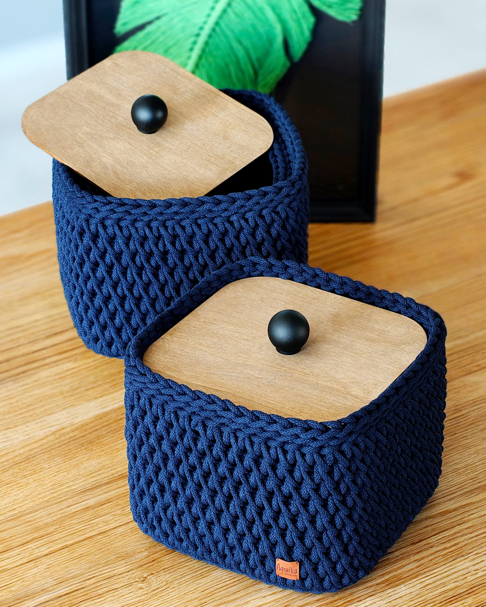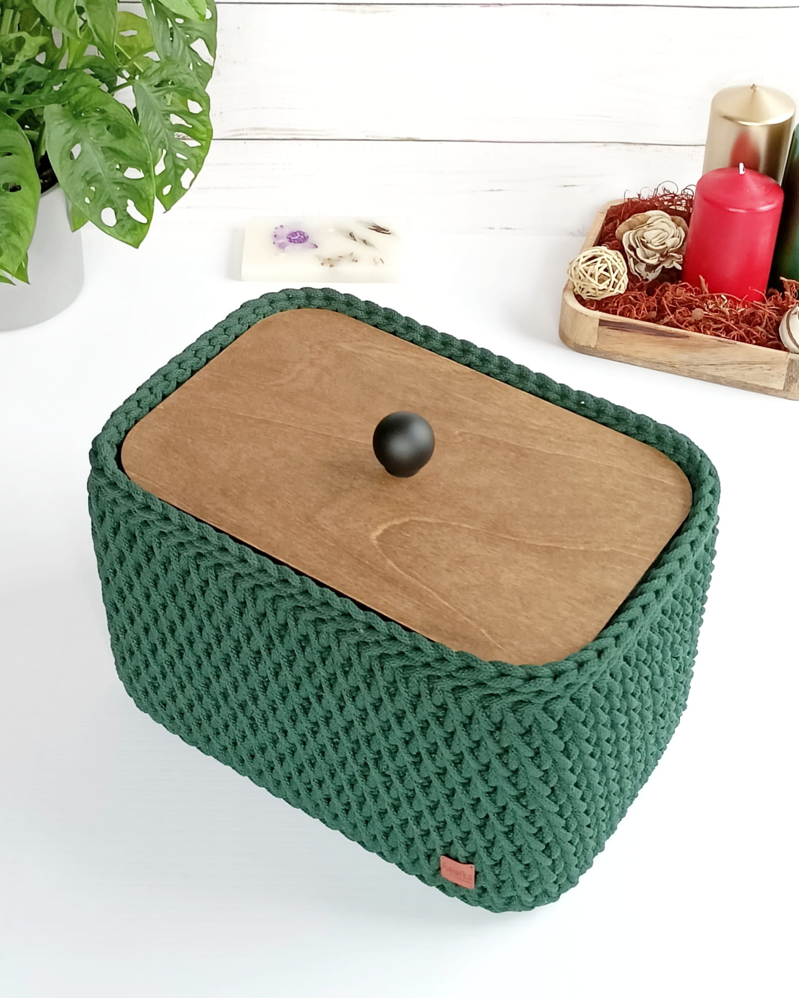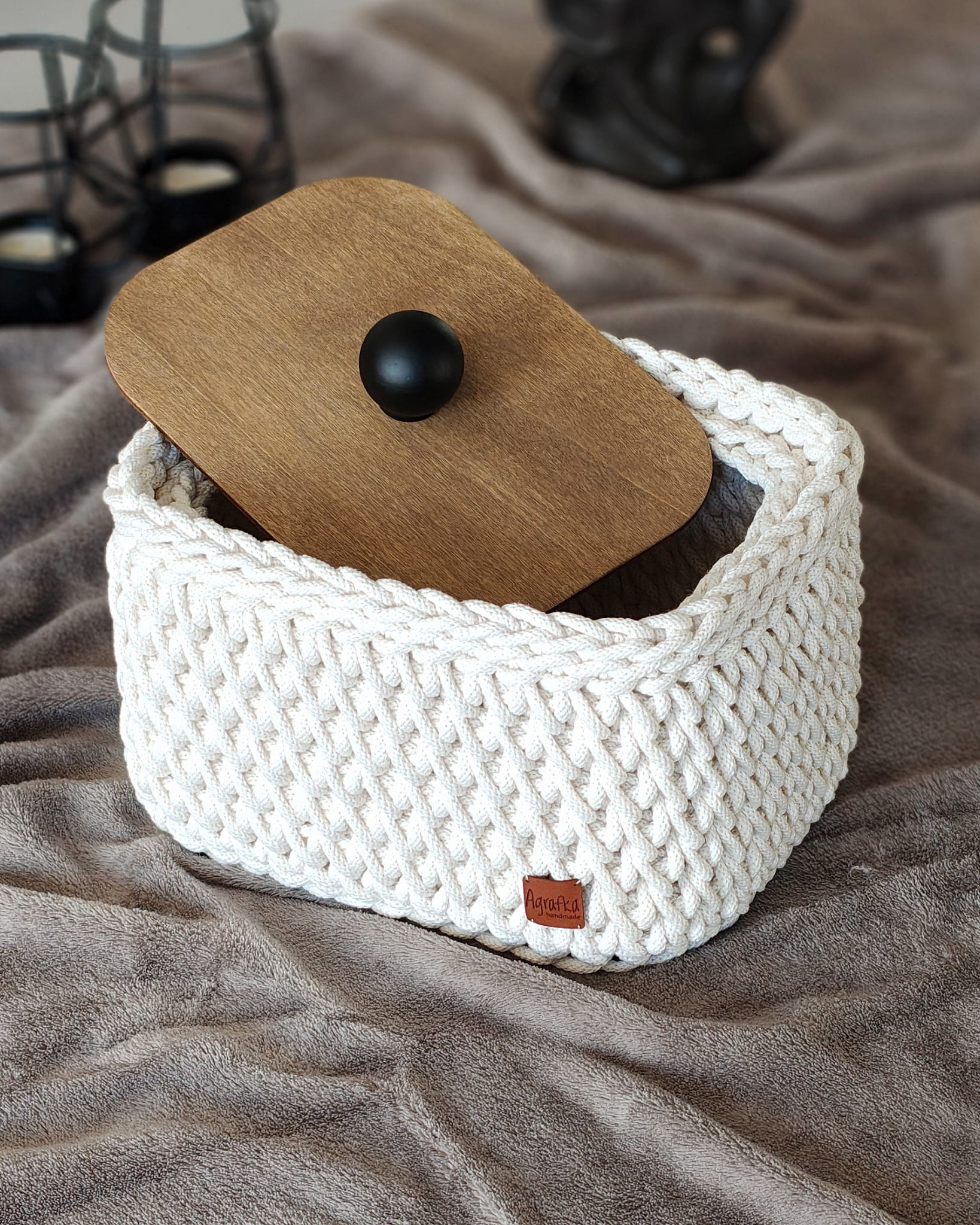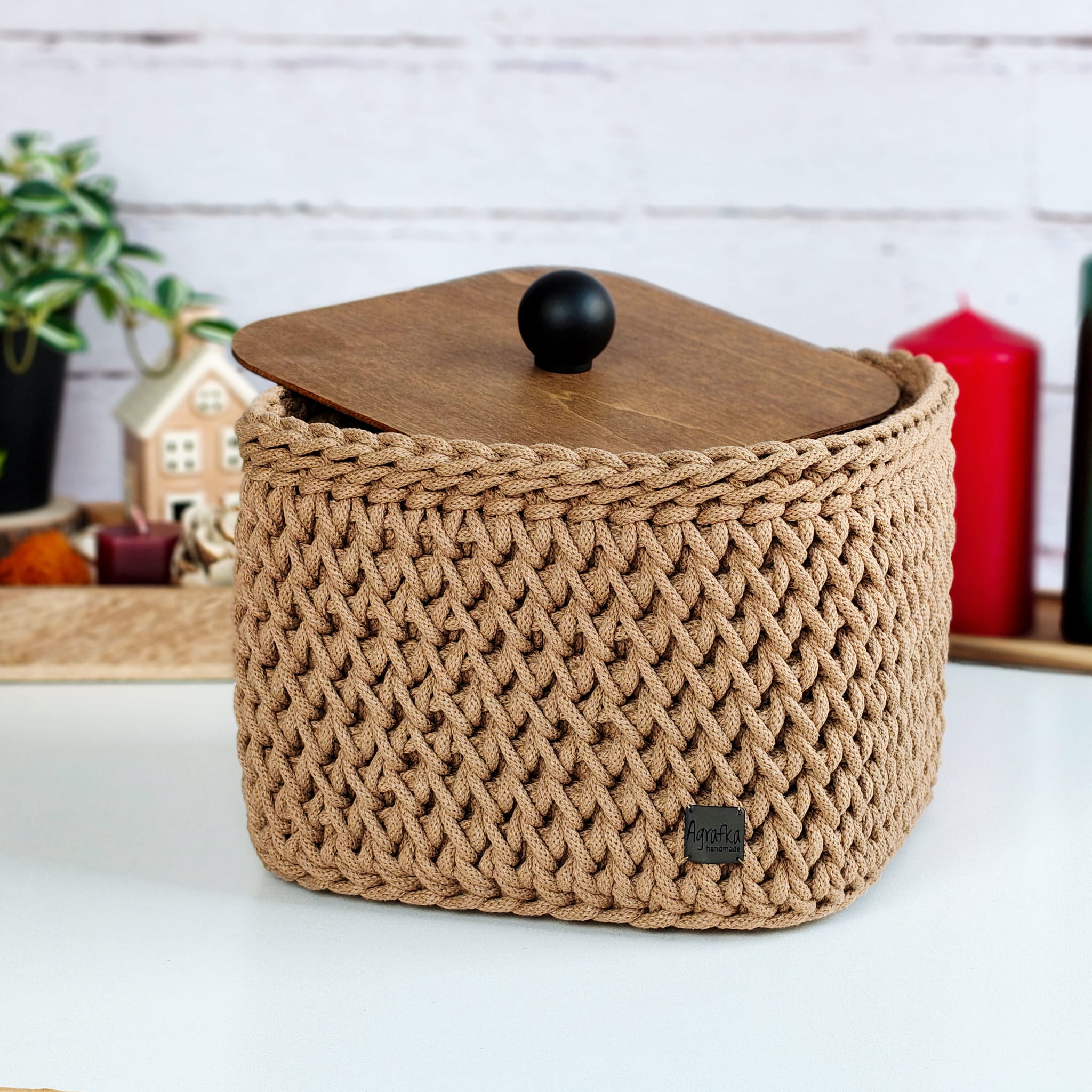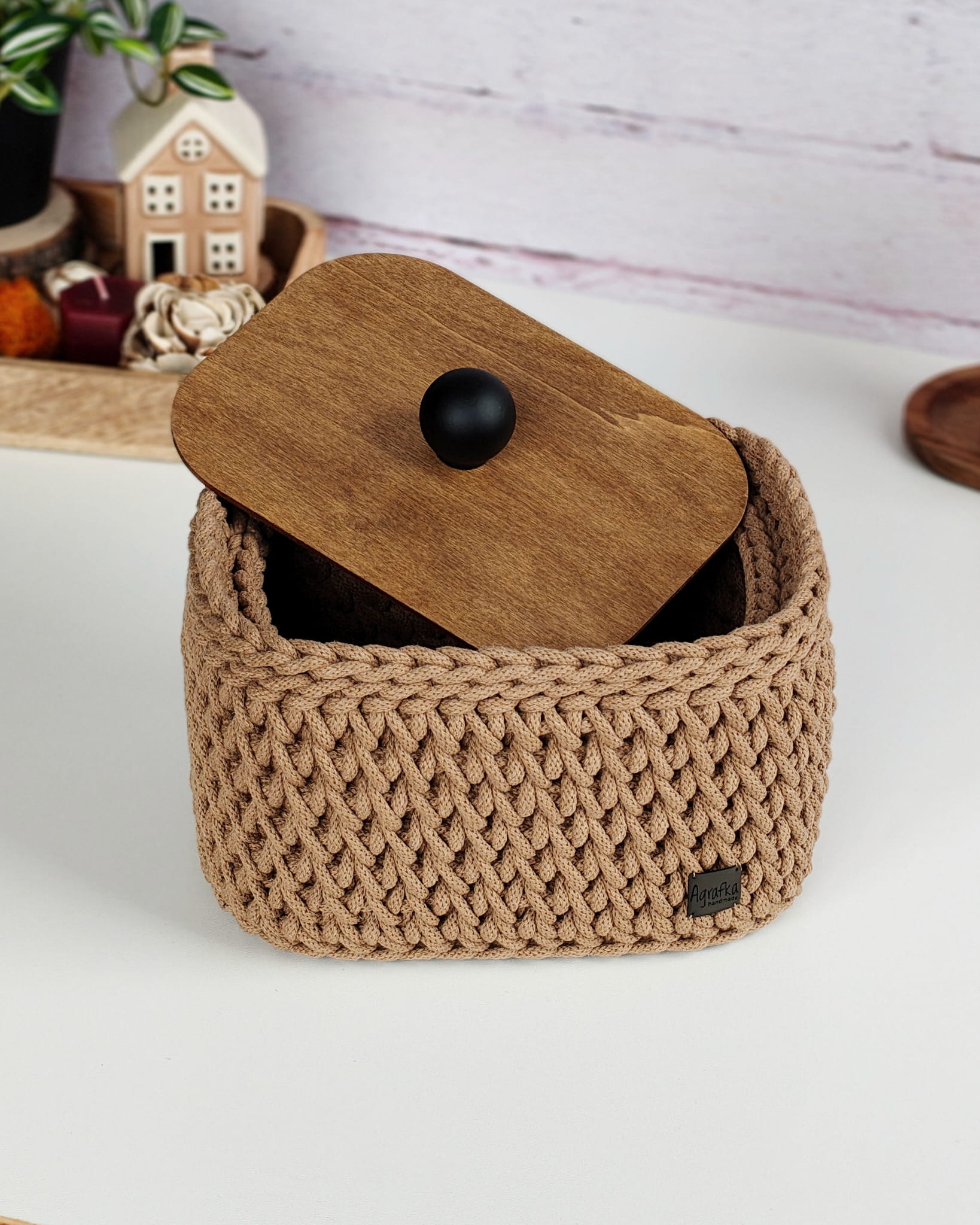 Ręcznie wykonany koszyk szydełkowy z wysokiej jakości sznurka bawełnianego, wyposażony w drewniane dno i dopasowaną pokrywę z olejowanej sklejki. Idealny do przechowywania drobiazgów, kosmetyków i dodatków w każdym wnętrzu.