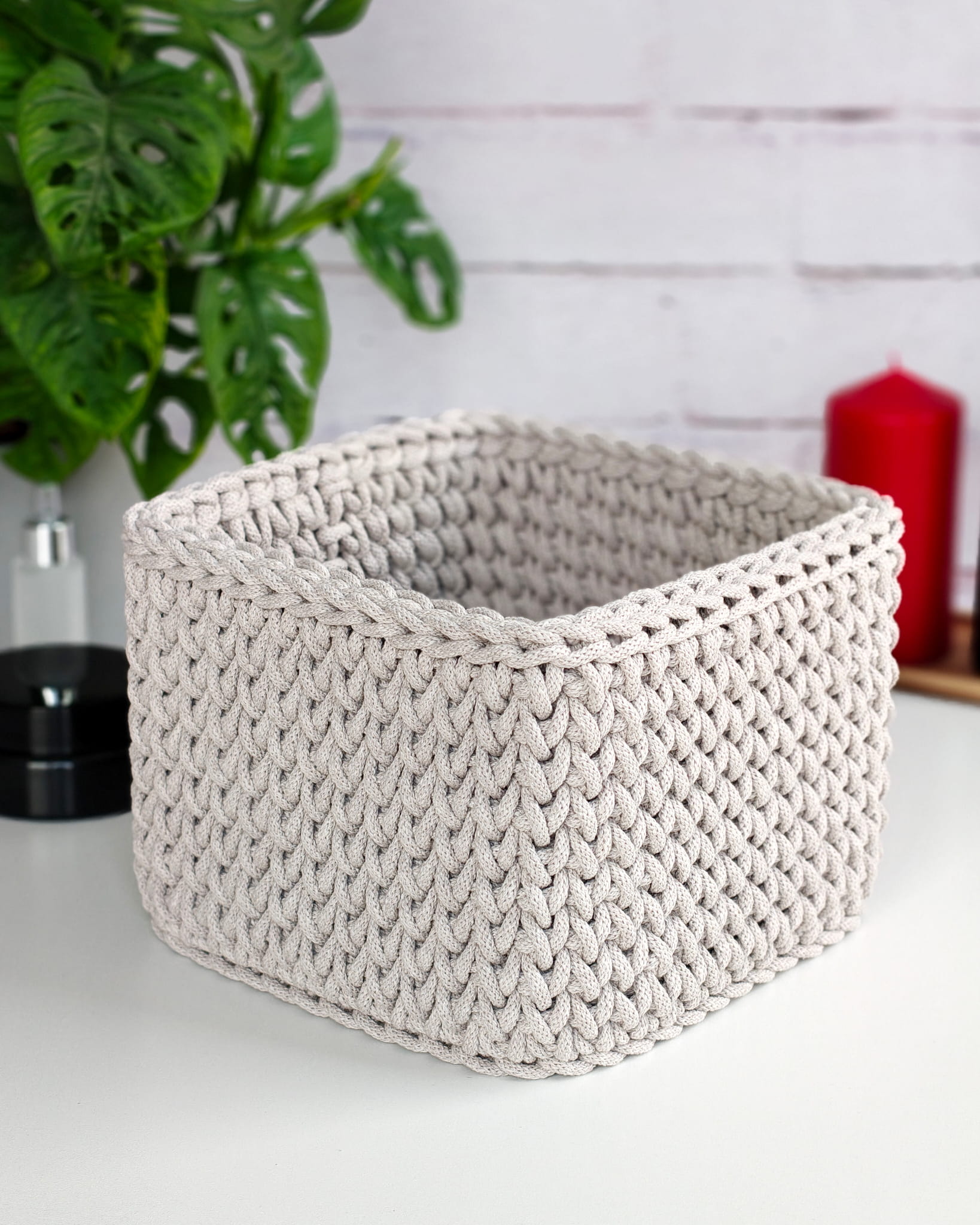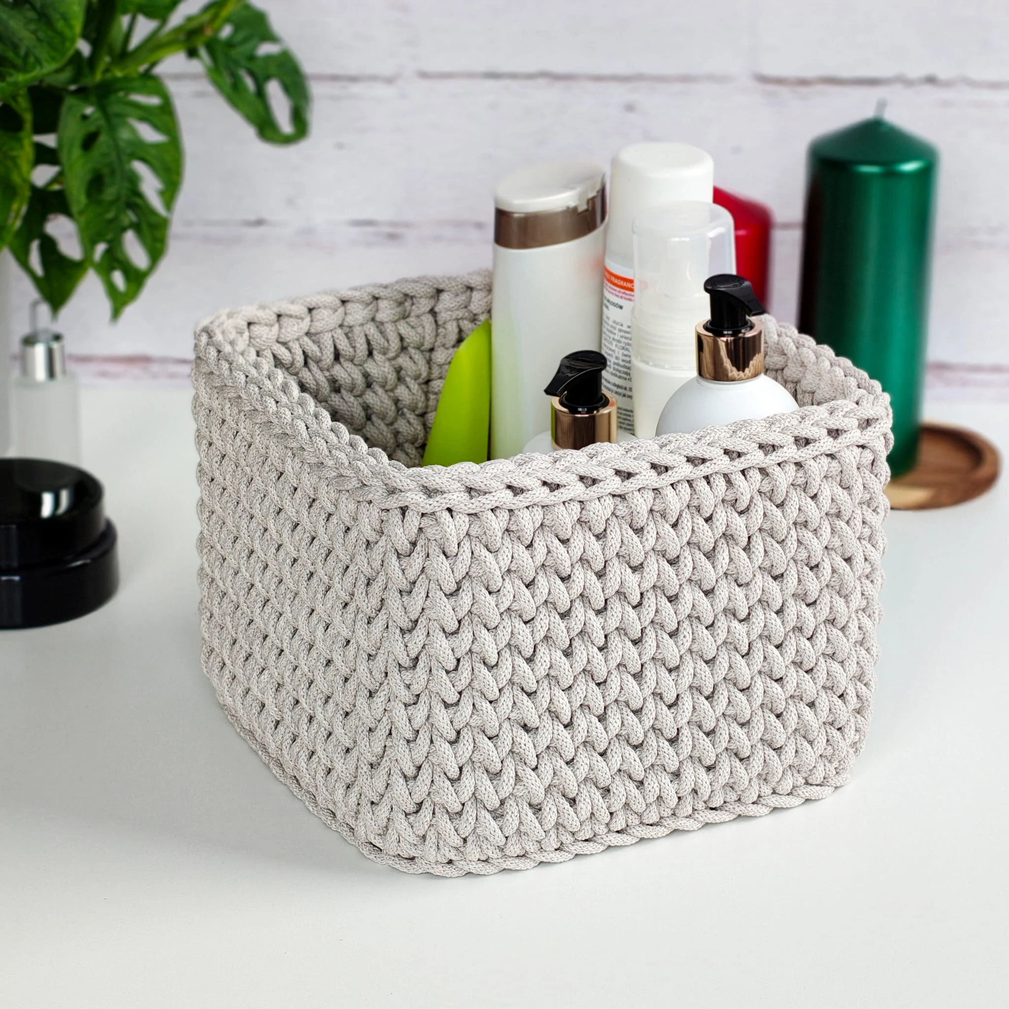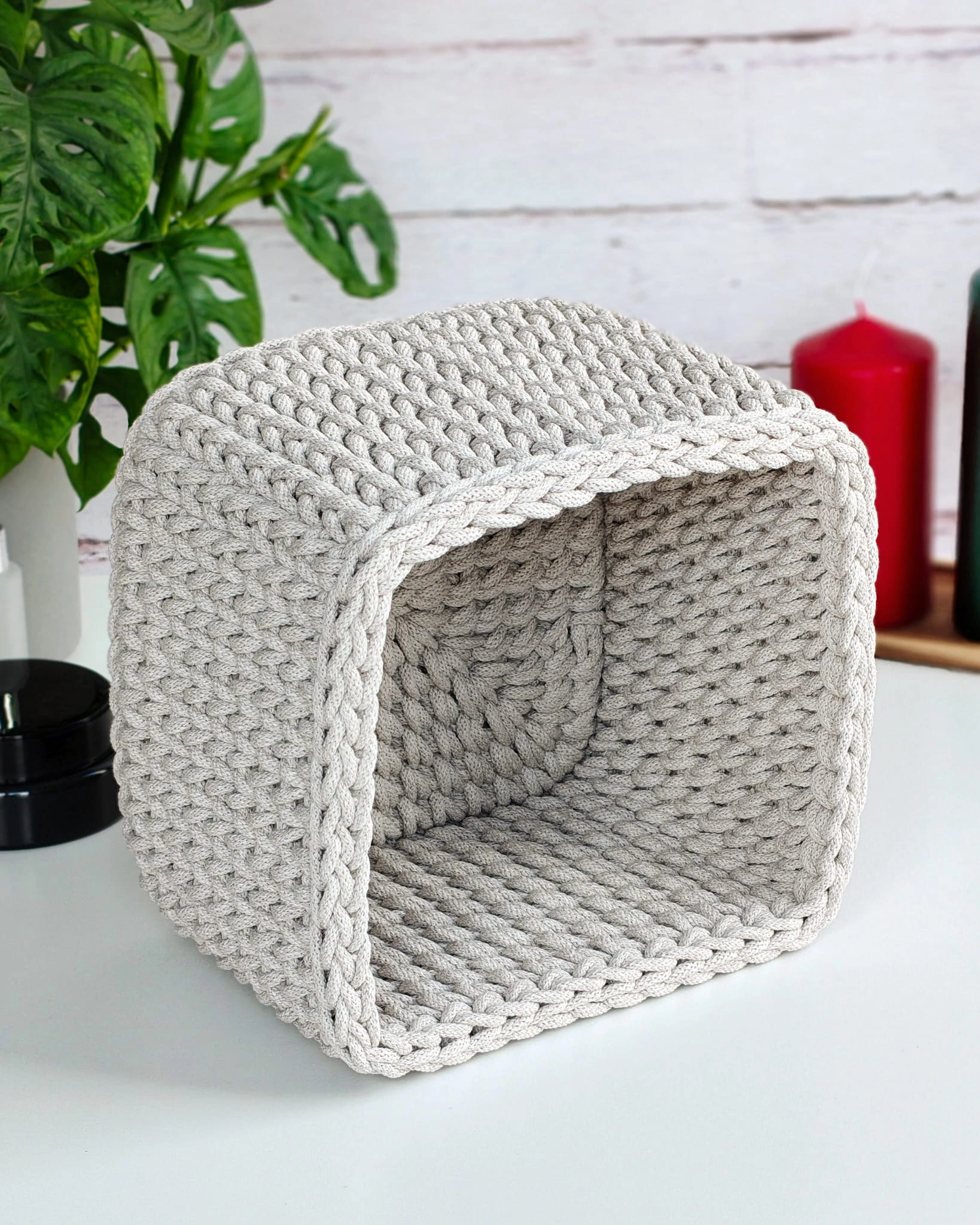 Ręcznie robiony koszyk kwadratowy ze sznurka bawełnianego. Pojemny, solidny i funkcjonalny organizer do domu, dostępny w różnych rozmiarach.