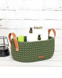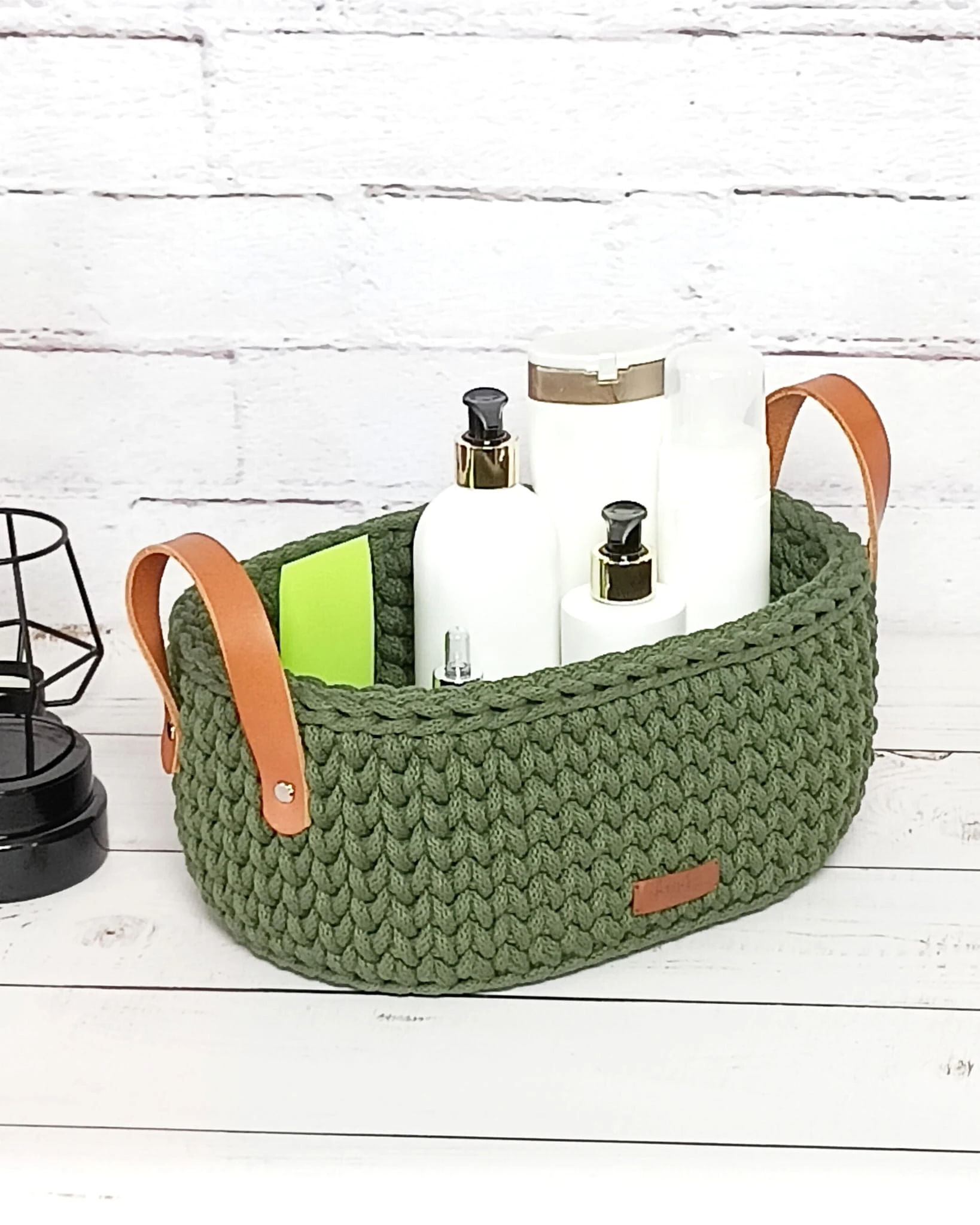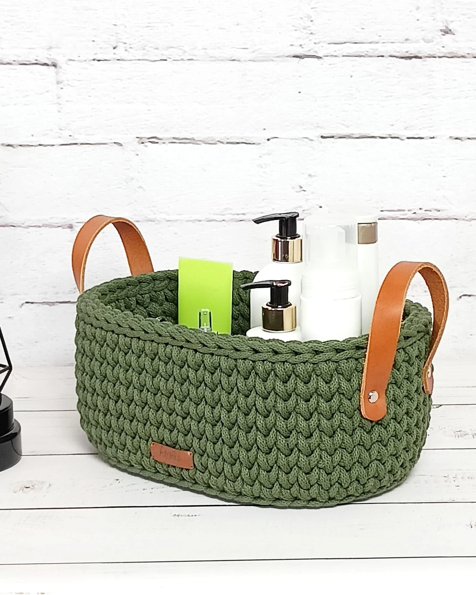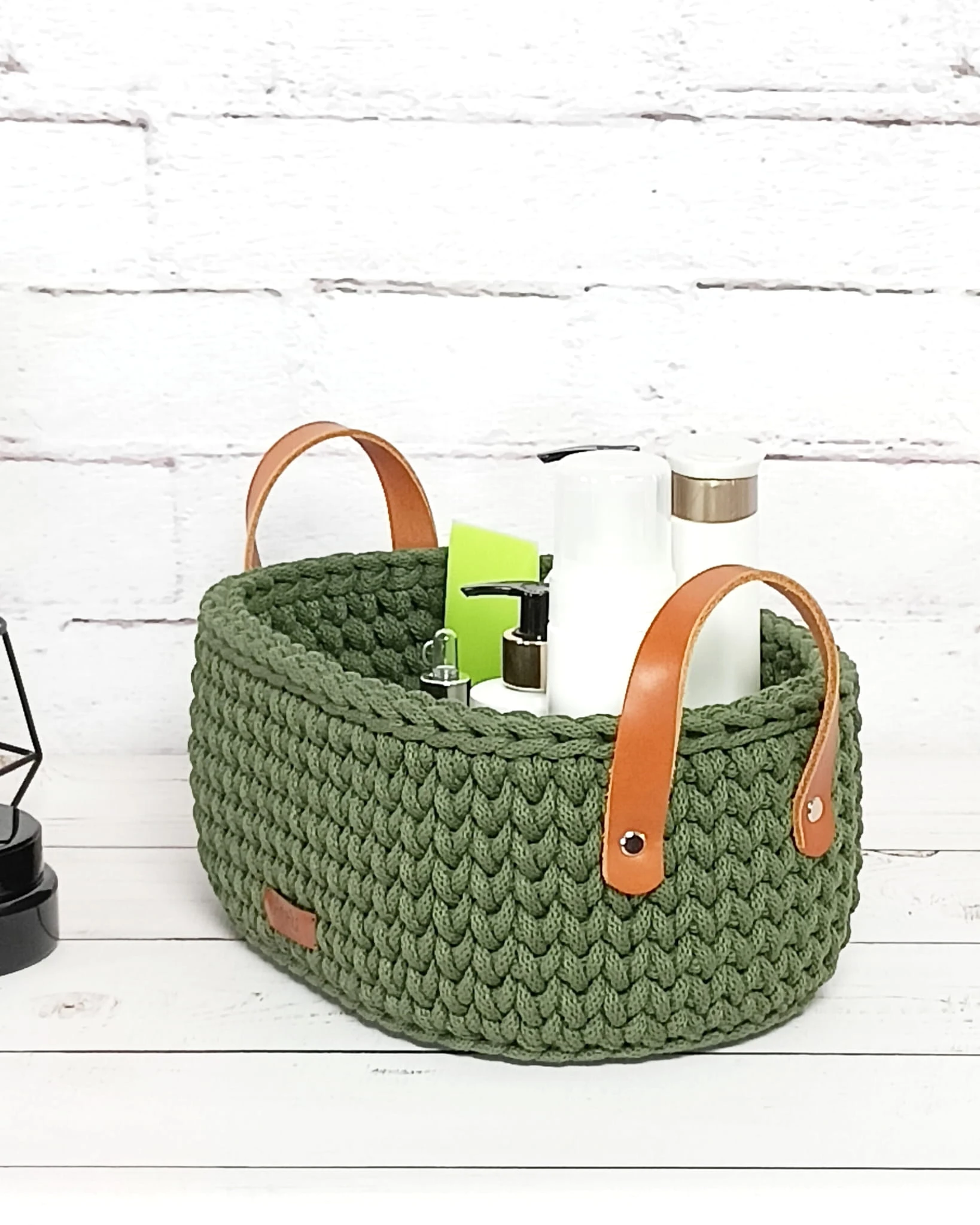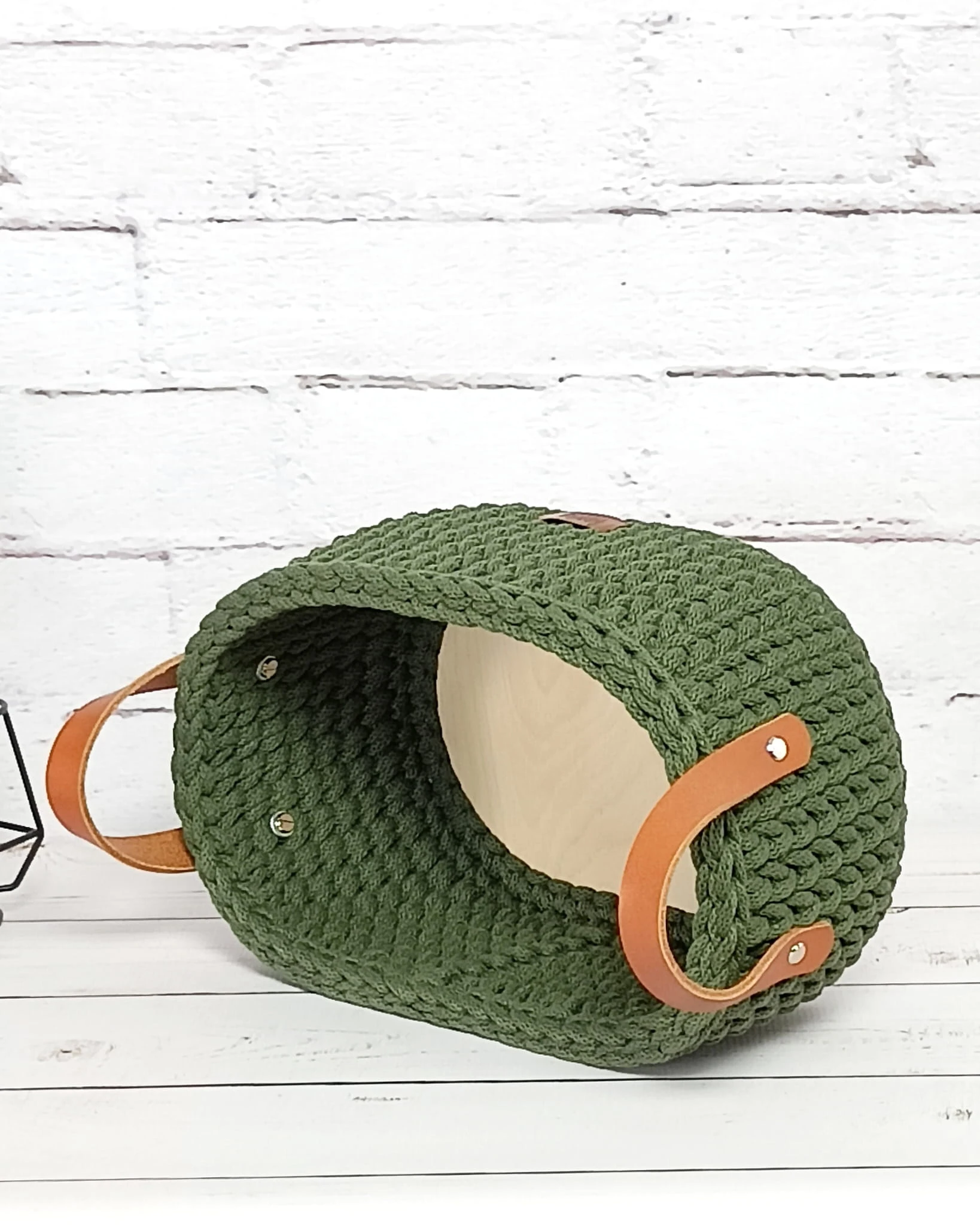 Owalny koszyk szydełkowy wykonany ręcznie ze sznurka bawełnianego, osadzony na stabilnej drewnianej bazie. Uchwyty wykonane ze skóry naturalnej. Idealny do estetycznej organizacji przestrzeni.