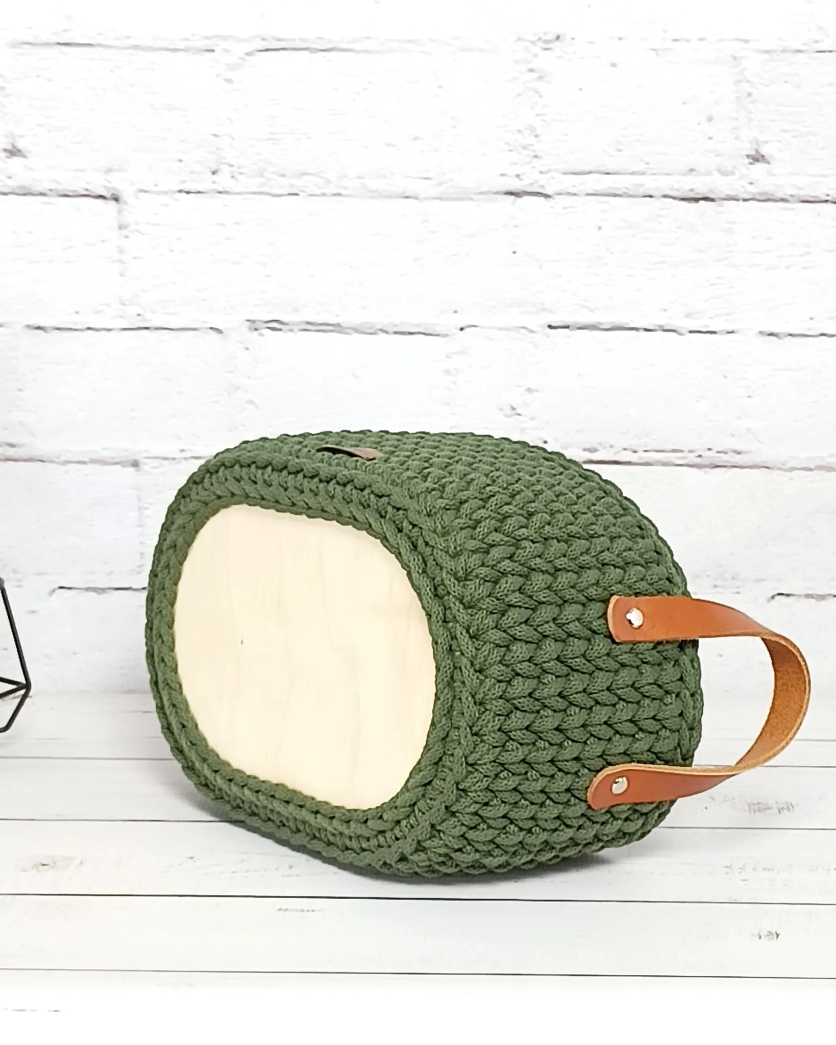 Owalny koszyk szydełkowy na drewnianej bazie to połączenie naturalnych materiałów, solidnej konstrukcji i dekoracyjnego charakteru. Wykonany ręcznie z wysokiej jakości sznurka bawełnianego, posiada stabilne drewniane dno, które usztywnia całość i pomaga zachować idealny kształt nawet przy pełnym obciążeniu.