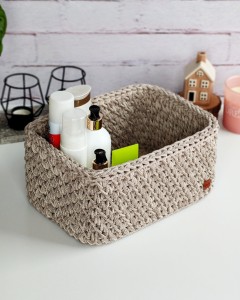 Koszyk został wykonany ze sznurka bawełnianego. Stabilna, drewniana baza zapewnia odpowiednią sztywność i komfort użytkowania, nawet przy większym obciążeniu. Prostokątny kształt ułatwia organizację przestrzeni na półkach, w szufladach czy na blatach.