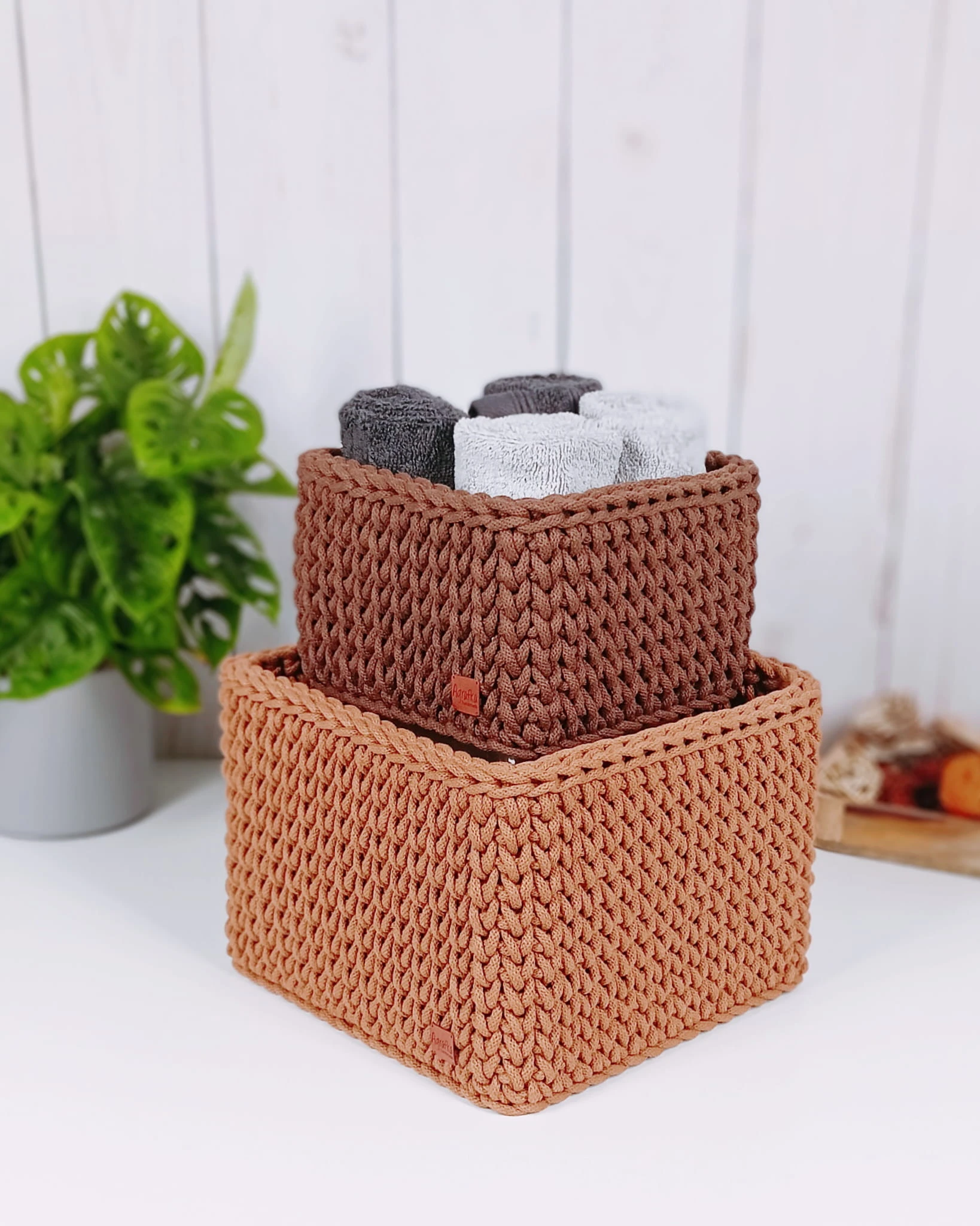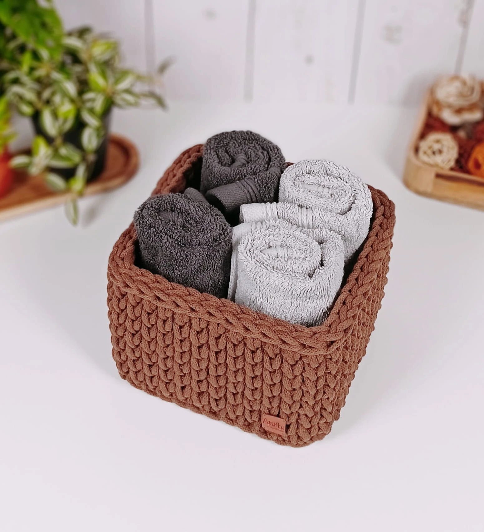 Kwadratowy koszyk szydełkowy wykonany ręcznie ze sznurka bawełnianego, osadzony na stabilnej bazie z drewnianej sklejki. Dostępny w kilku rozmiarach i szerokiej gamie kolorystycznej – idealny do przechowywania i organizacji przestrzeni.