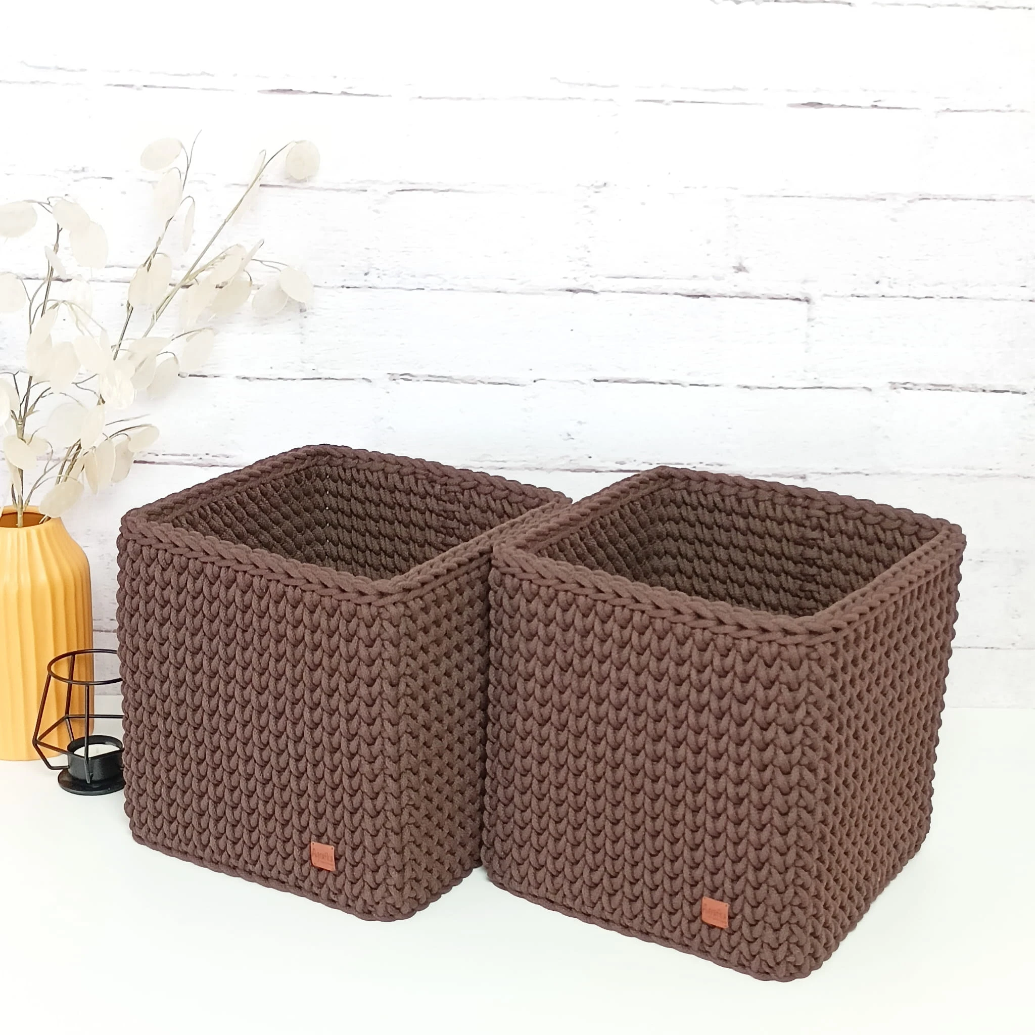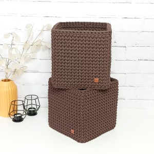 Kwadratowy koszyk szydełkowy wykonany ręcznie ze sznurka bawełnianego. Dostępny w kilku rozmiarach i szerokiej gamie kolorów – idealny do przechowywania i organizacji przestrzeni.