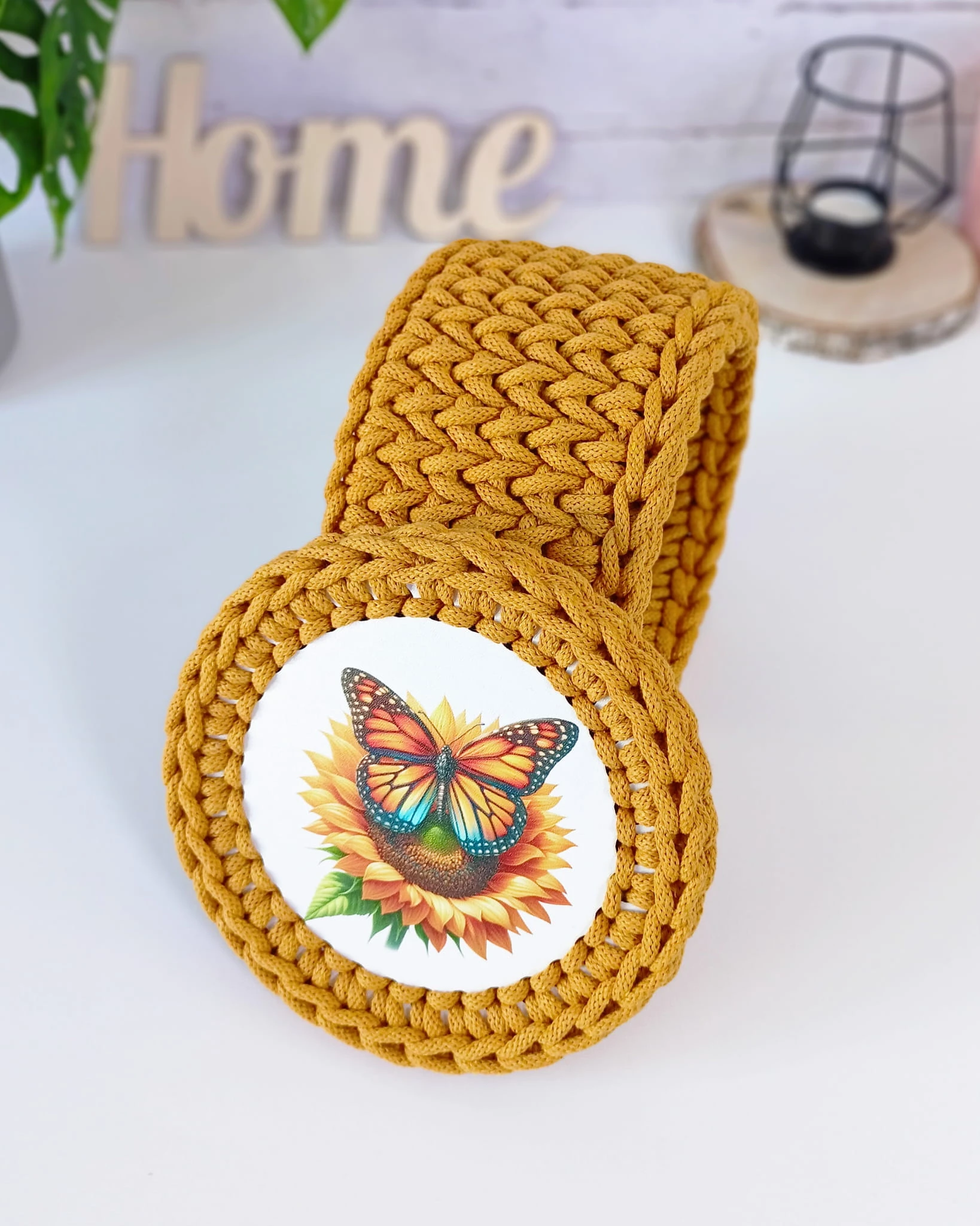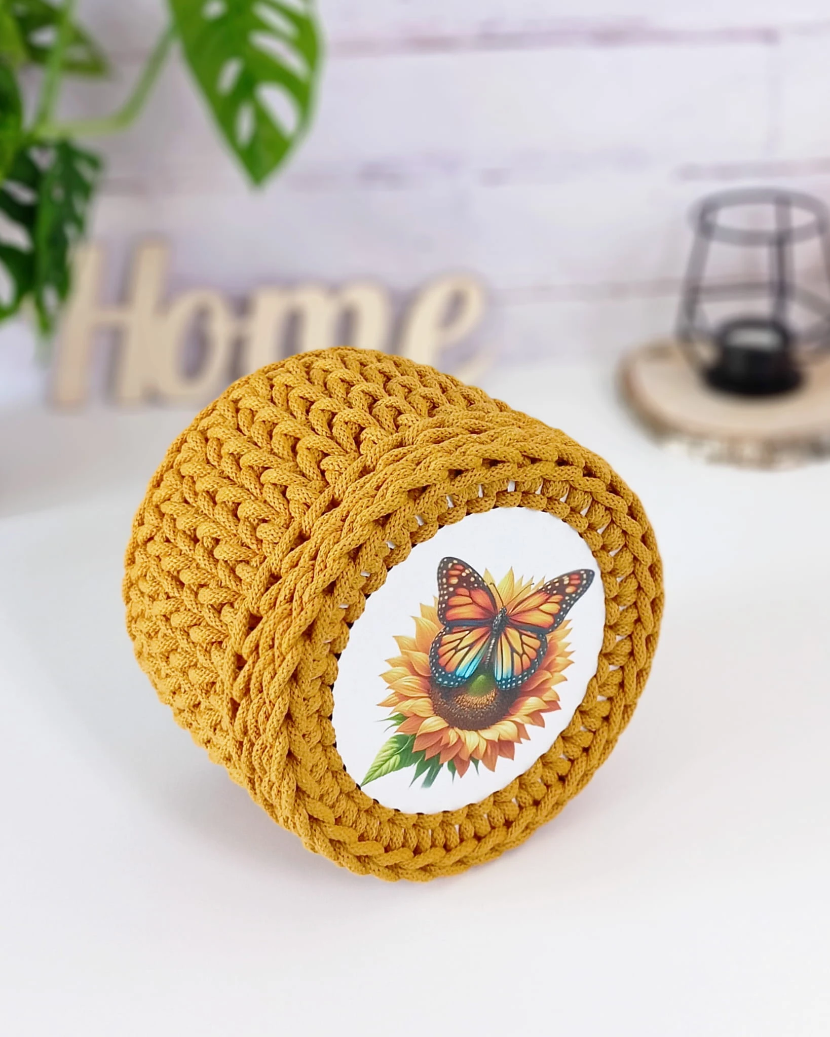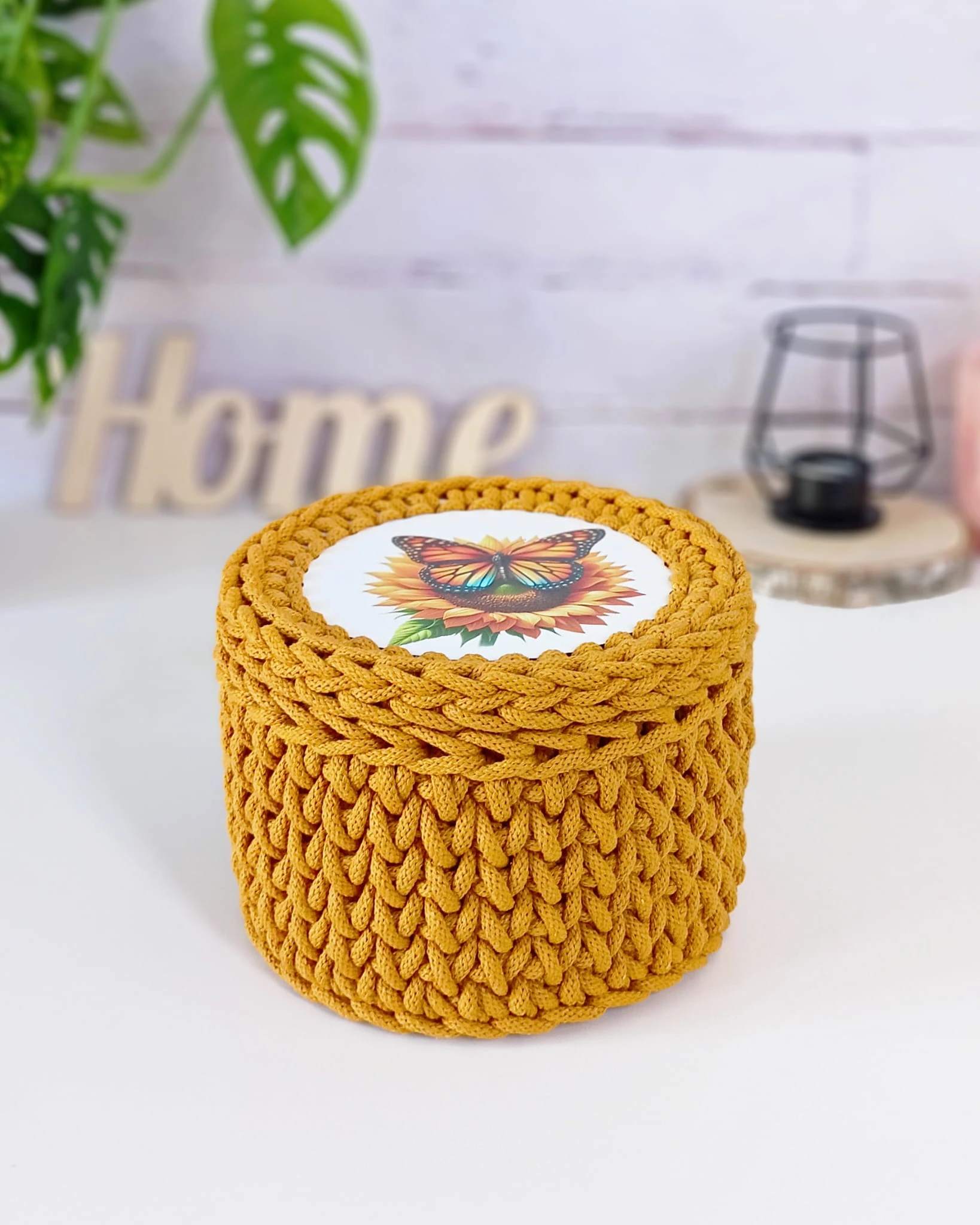 Ręcznie wykonany okrągły koszyk z pokrywą. Dno i wieczko z płyty MDF, wieczko z dekoracyjnym nadrukiem słonecznika z motylem. Idealny do przechowywania drobiazgów.