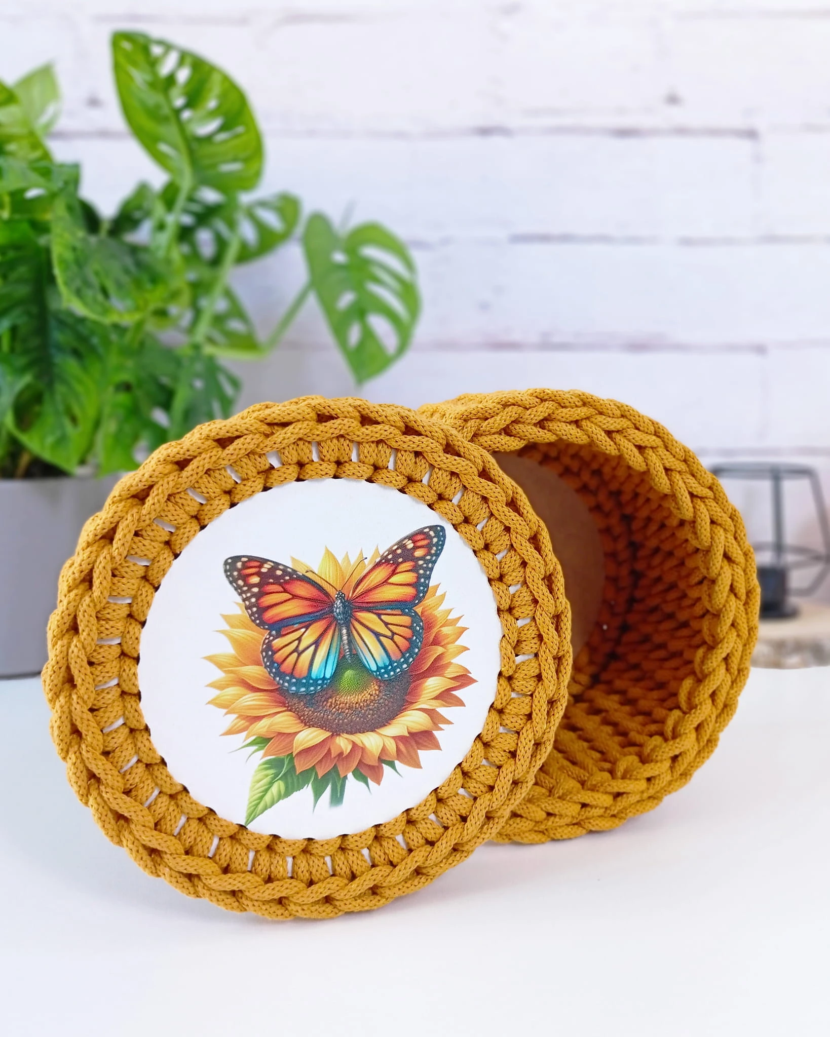 Okrągły koszyk z pokrywą – słonecznik z motylem