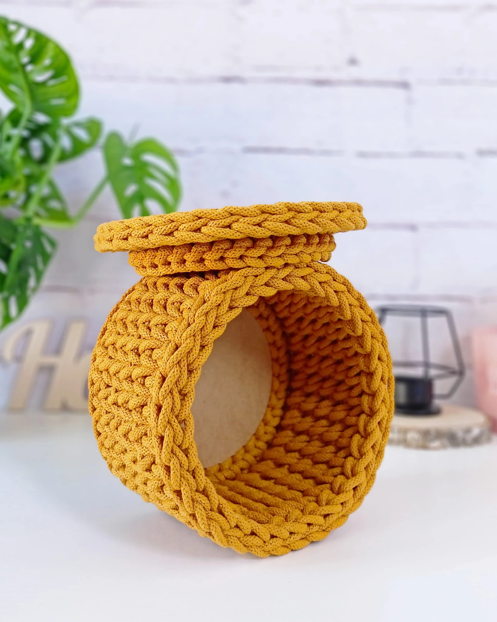 Ten okrągły koszyk z pokrywą to połączenie funkcjonalności i wyjątkowej estetyki. W całości wykonany ręcznie z wysokiej jakości sznurka bawełnianego, zachwyca starannym splotem i solidną formą.