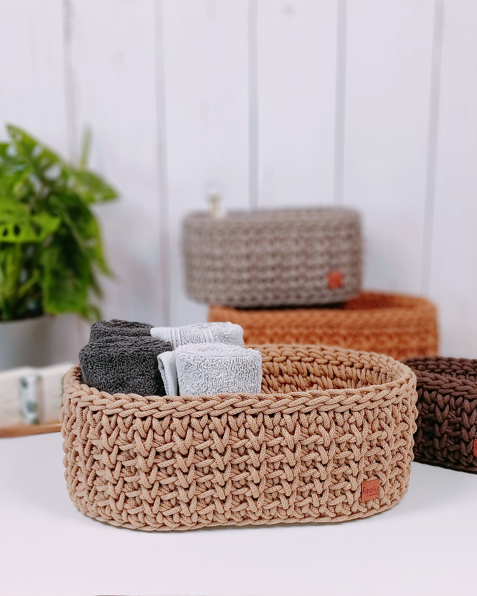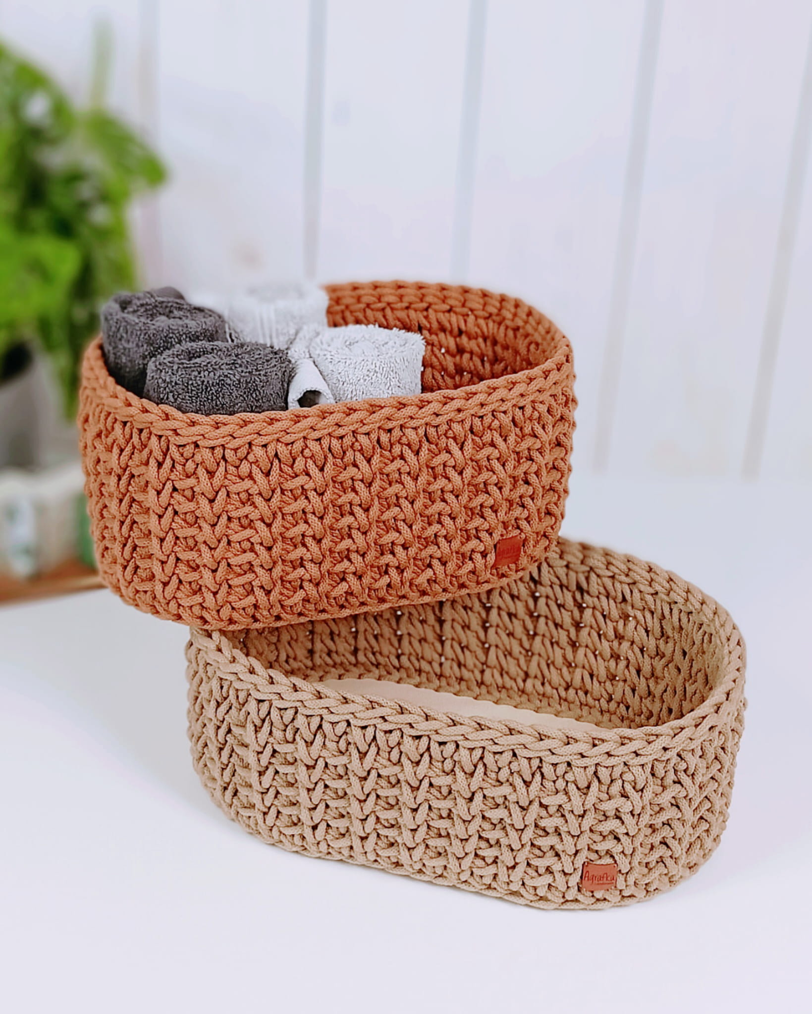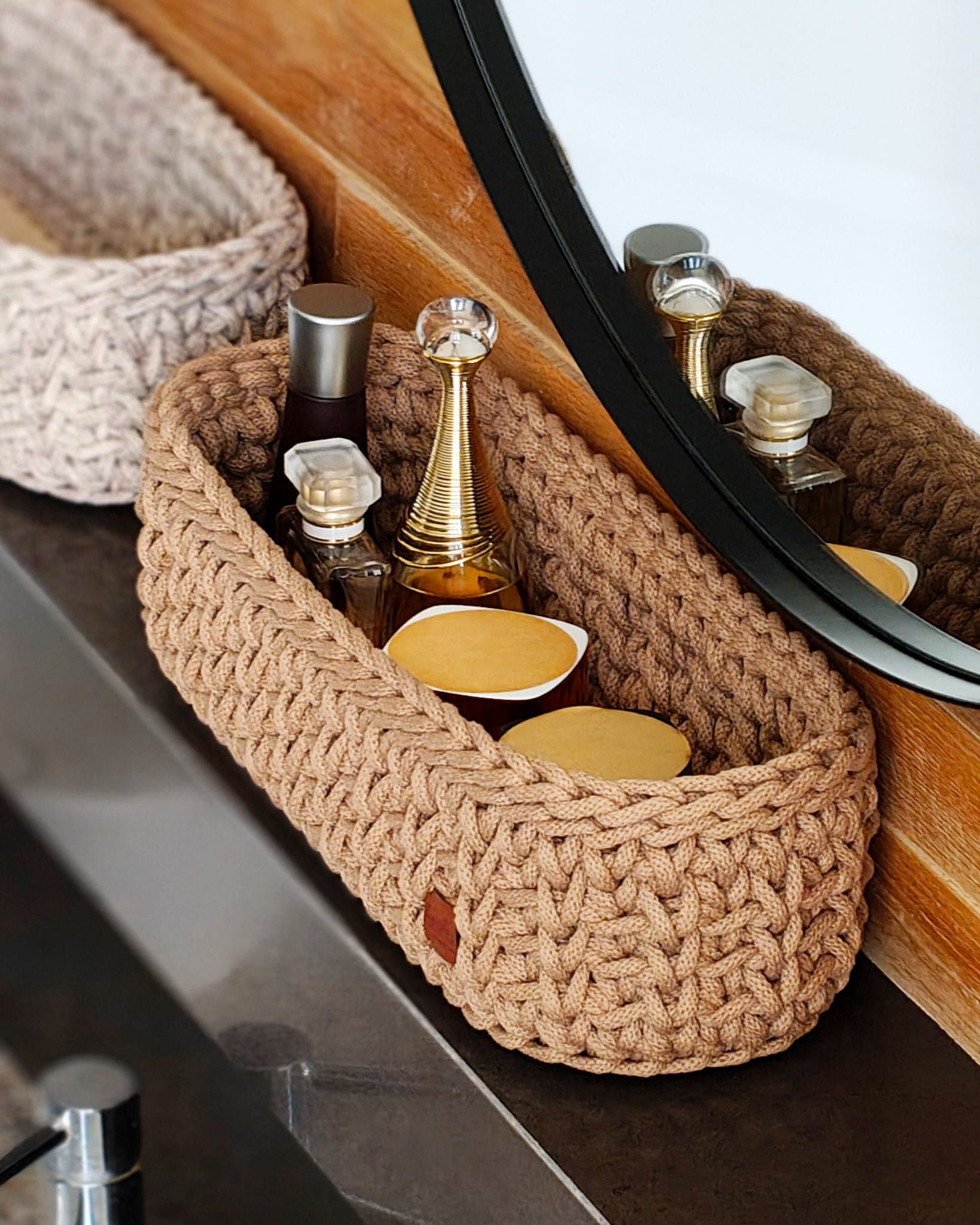 Owalny koszyk szydełkowy wykonany ręcznie ze sznurka bawełnianego, osadzony na stabilnej drewnianej bazie. Dostępny w kilku rozmiarach i szerokiej gamie kolorystycznej – idealny do estetycznej organizacji przestrzeni.