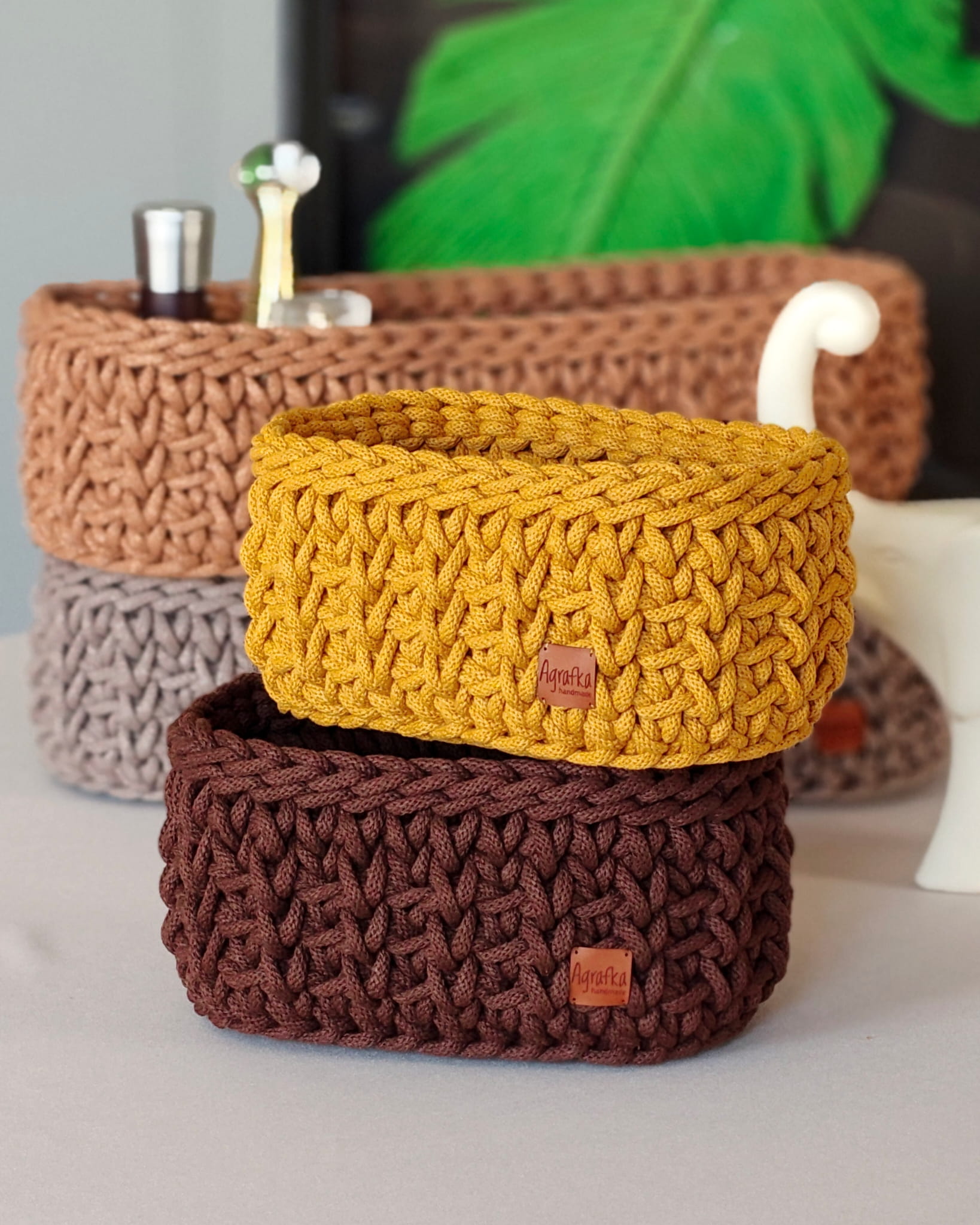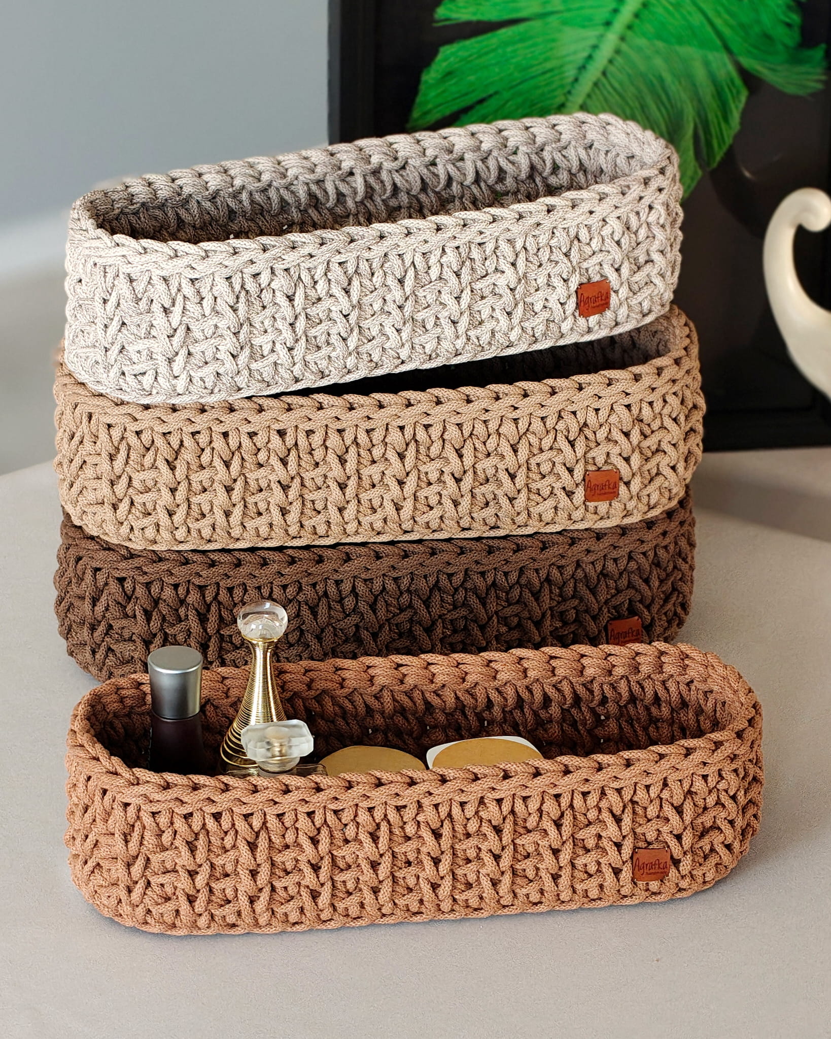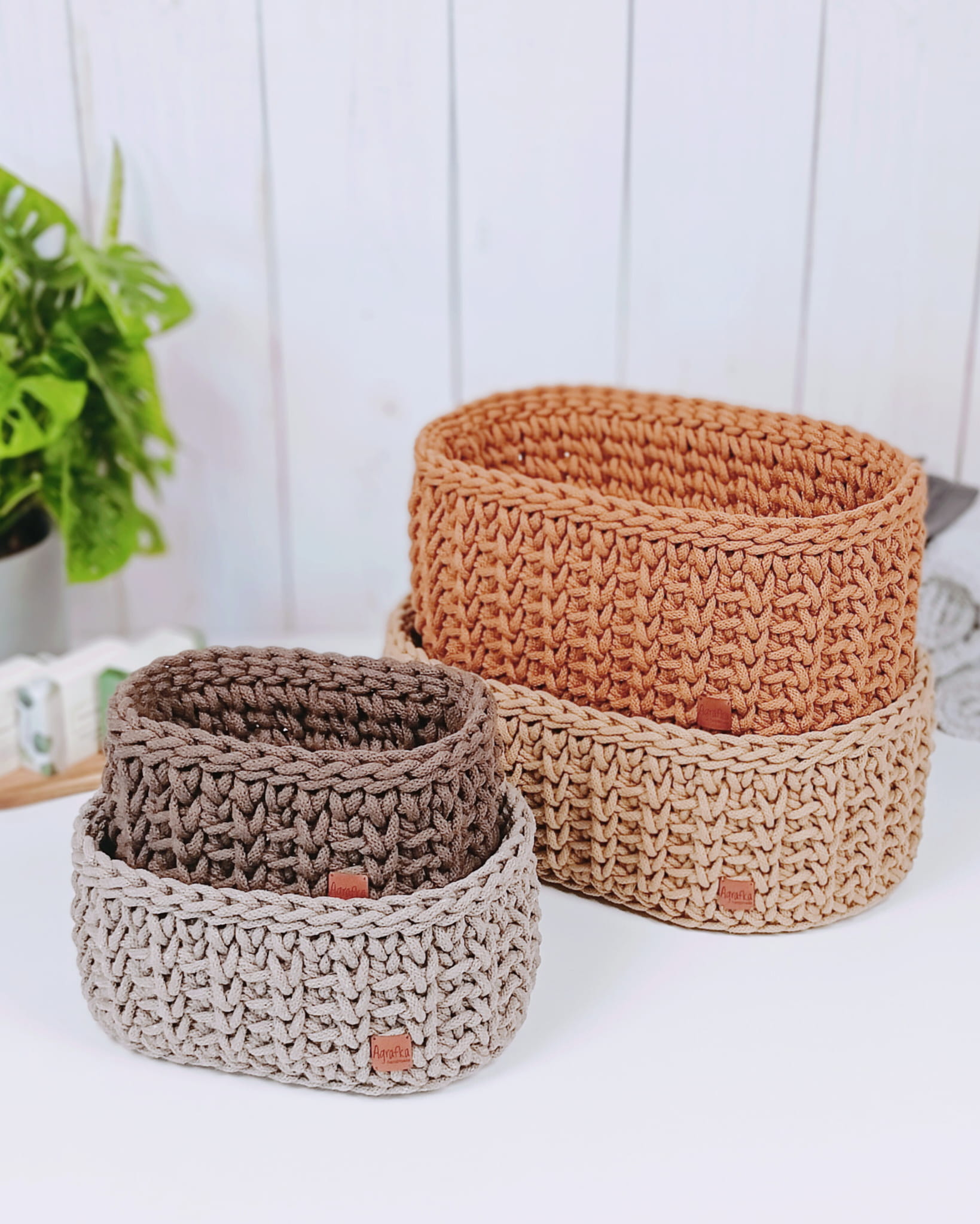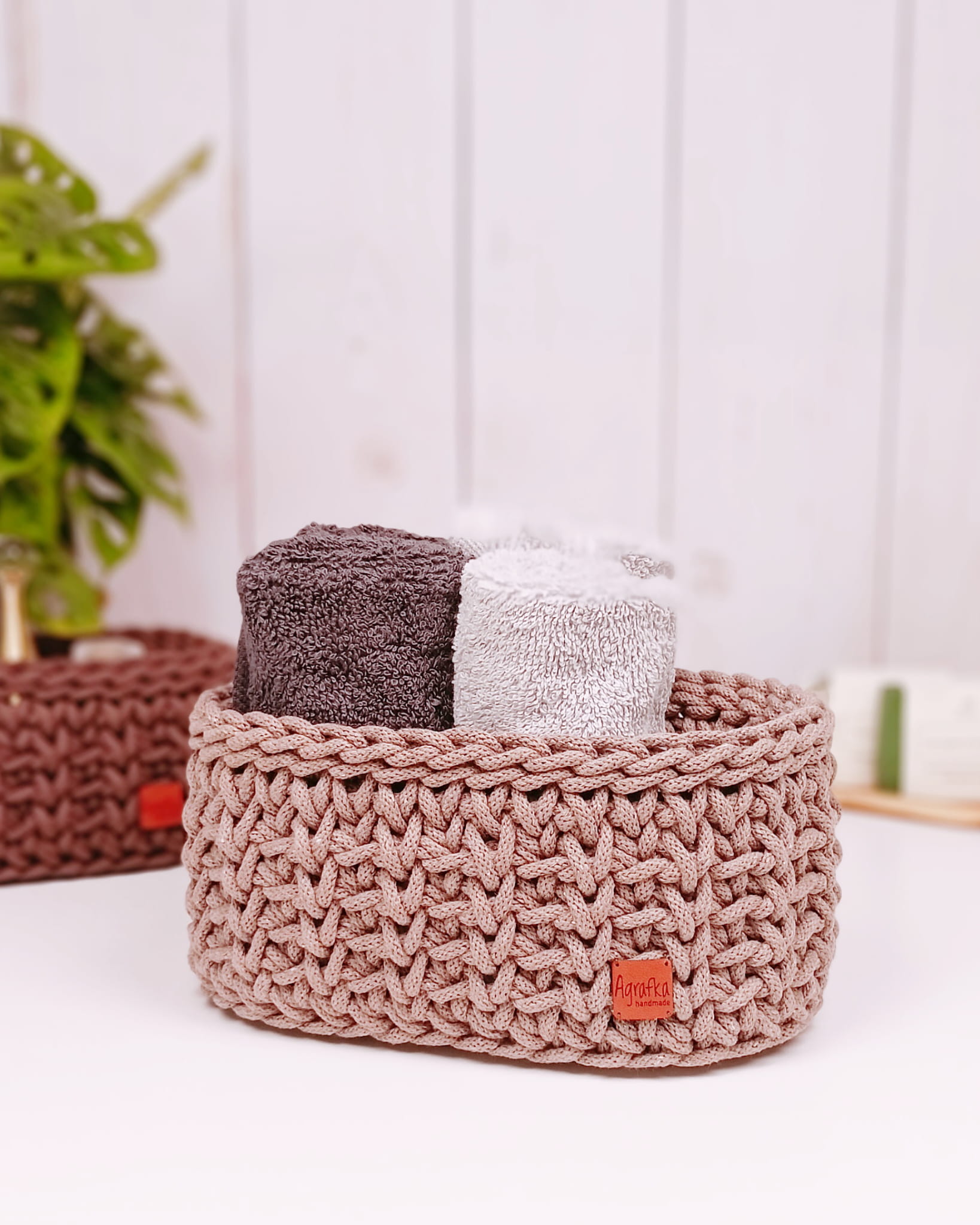 Owalny koszyk szydełkowy wykonany ręcznie ze sznurka bawełnianego, osadzony na stabilnej drewnianej bazie. Dostępny w kilku rozmiarach i szerokiej gamie kolorystycznej – idealny do estetycznej organizacji przestrzeni.