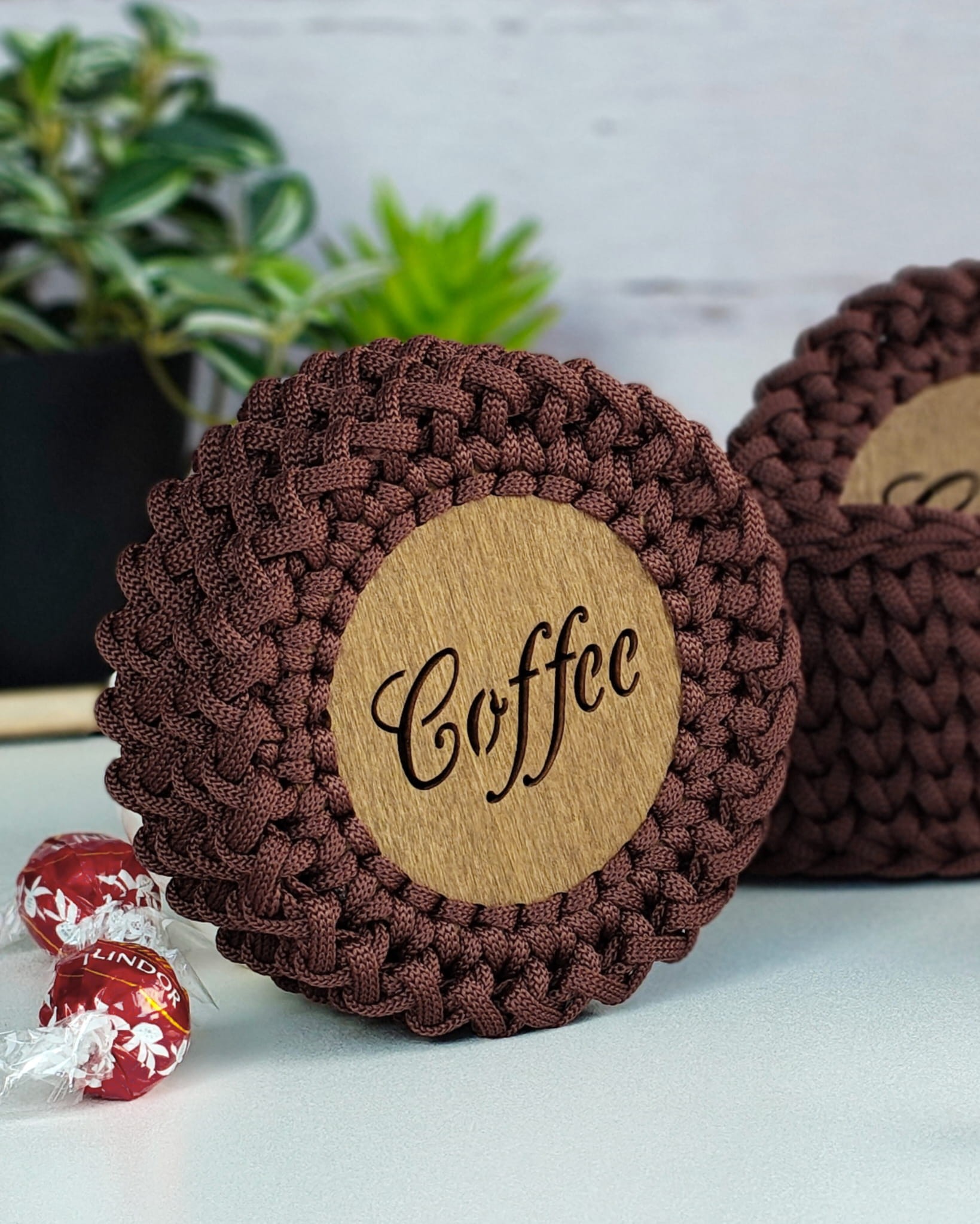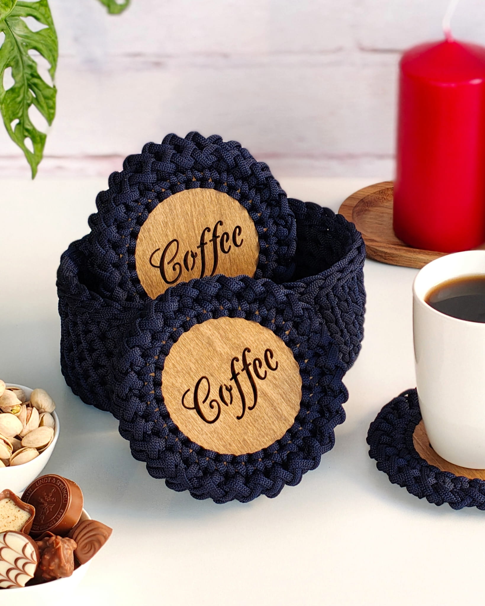Stylowy zestaw podkładek pod kubek, który łączy funkcjonalność z eleganckim wyglądem. Podkładki wykonane są ręcznie ze sznurka poliestrowego, który nie chłonie płynów i jest wyjątkowo łatwy w czyszczeniu. Każda z nich posiada drewnianą, olejowaną bazę, chroniącą powierzchnie przed ciepłem i wilgocią.