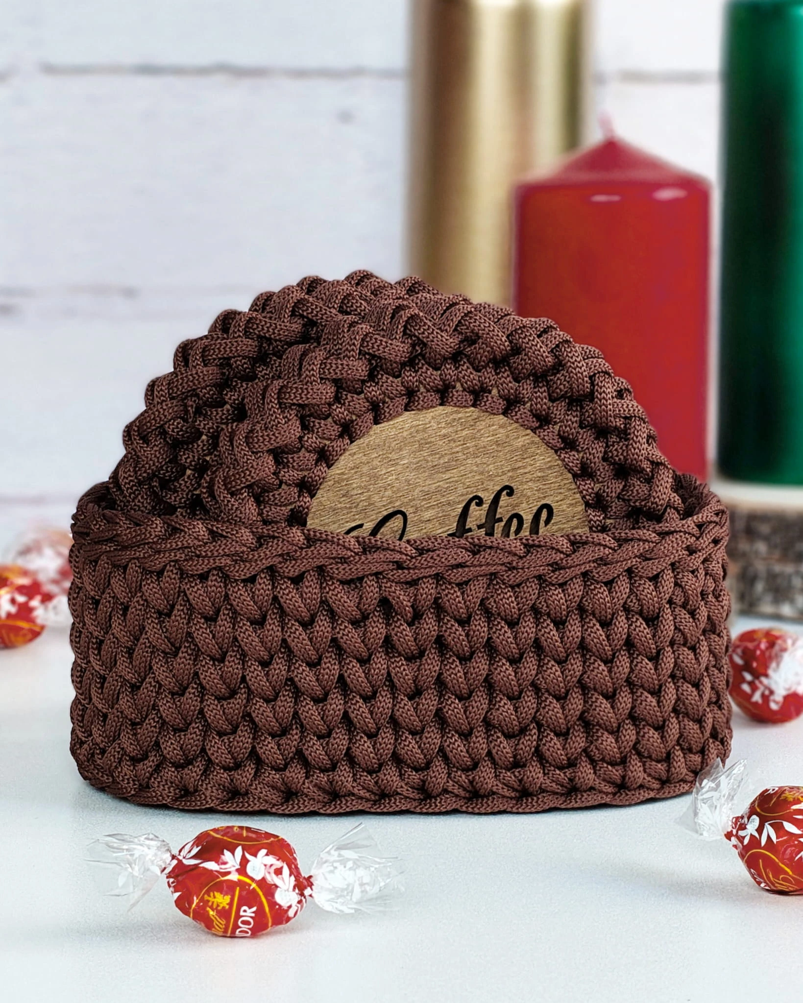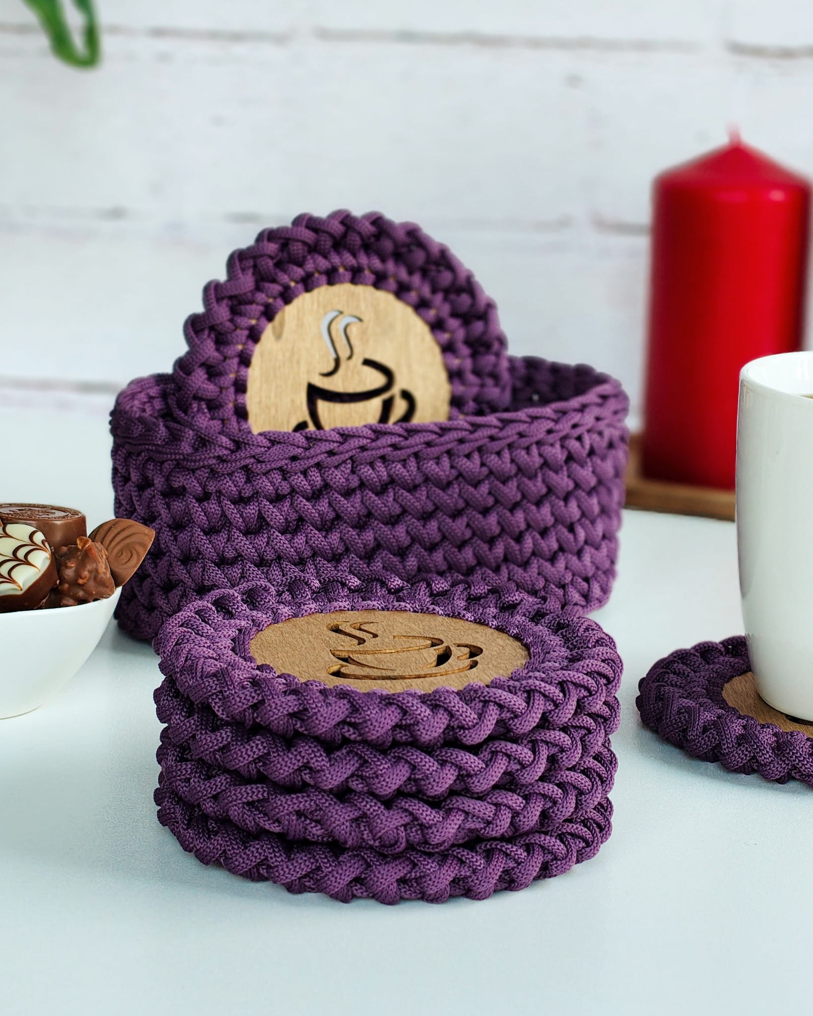 Ręcznie wykonany zestaw podkładek pod kubek ze sznurka poliestrowego na olejowanej, drewnianej bazie. W komplecie 6 podkładek oraz dopasowany koszyk/holder. Trwałe, odporne na wilgoć i łatwe w czyszczeniu – idealne do kawy i herbaty.