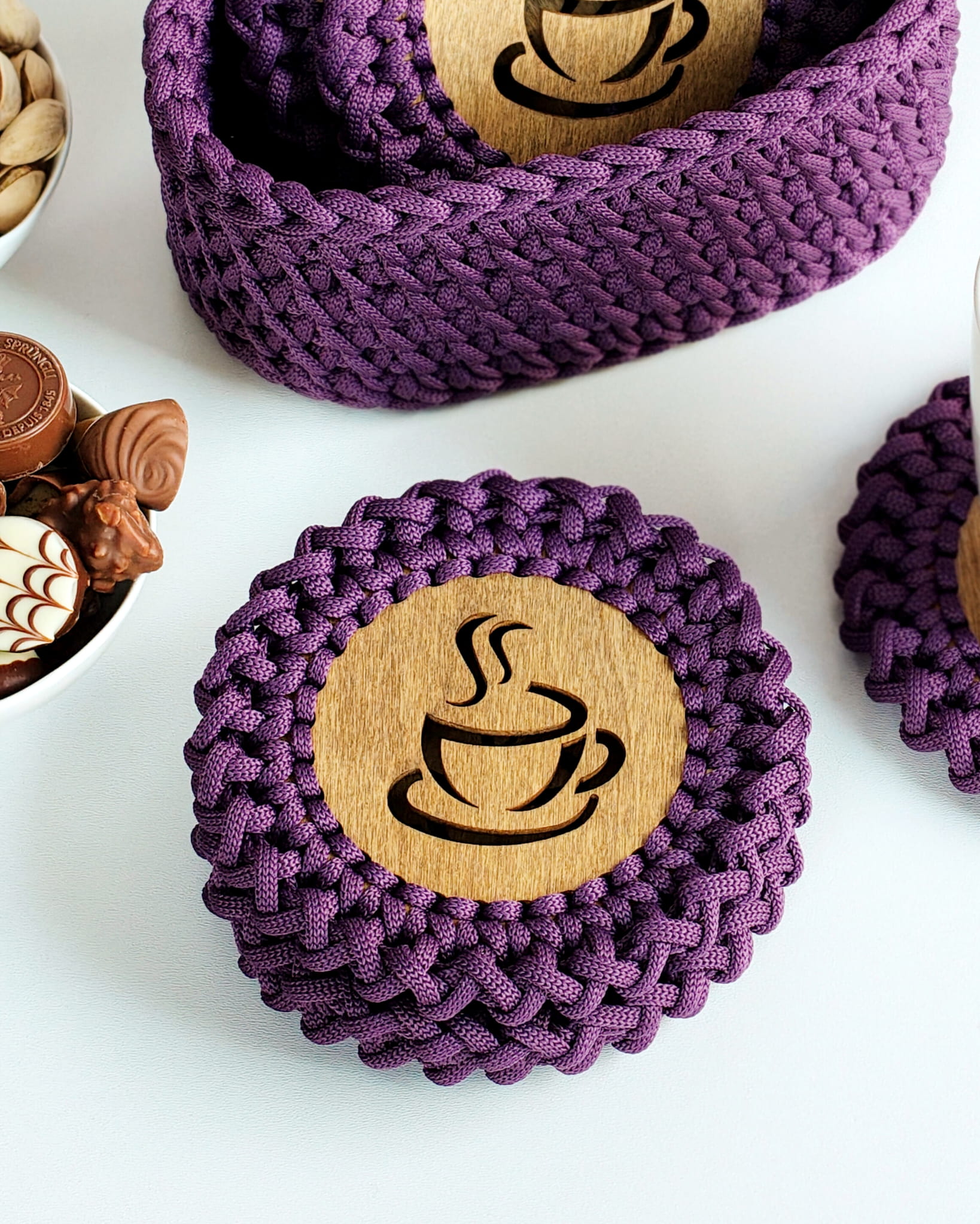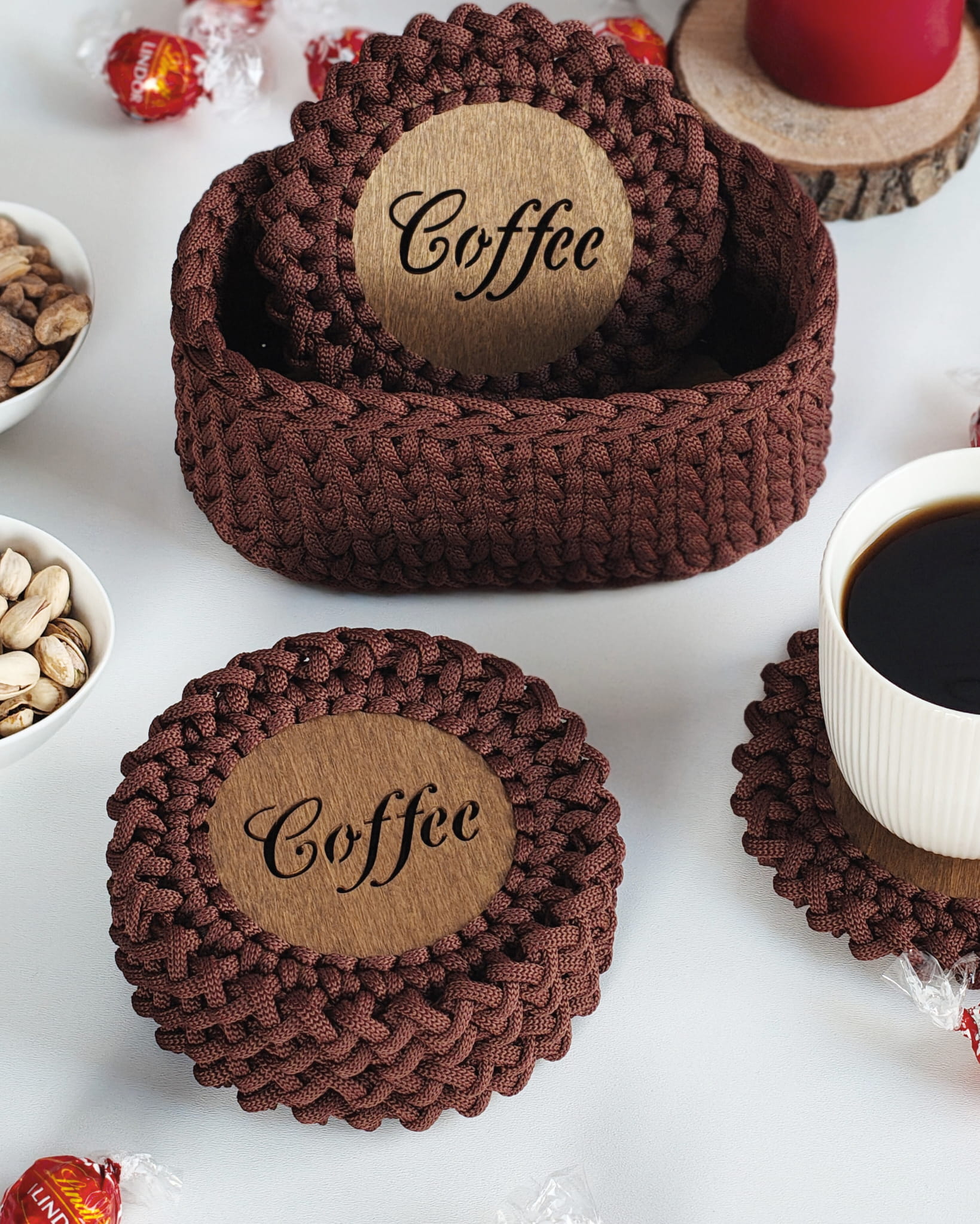 Ręcznie wykonany zestaw podkładek pod kubek ze sznurka poliestrowego na olejowanej, drewnianej bazie. W komplecie 6 podkładek oraz dopasowany koszyk/holder. Trwałe, odporne na wilgoć i łatwe w czyszczeniu – idealne do kawy i herbaty.