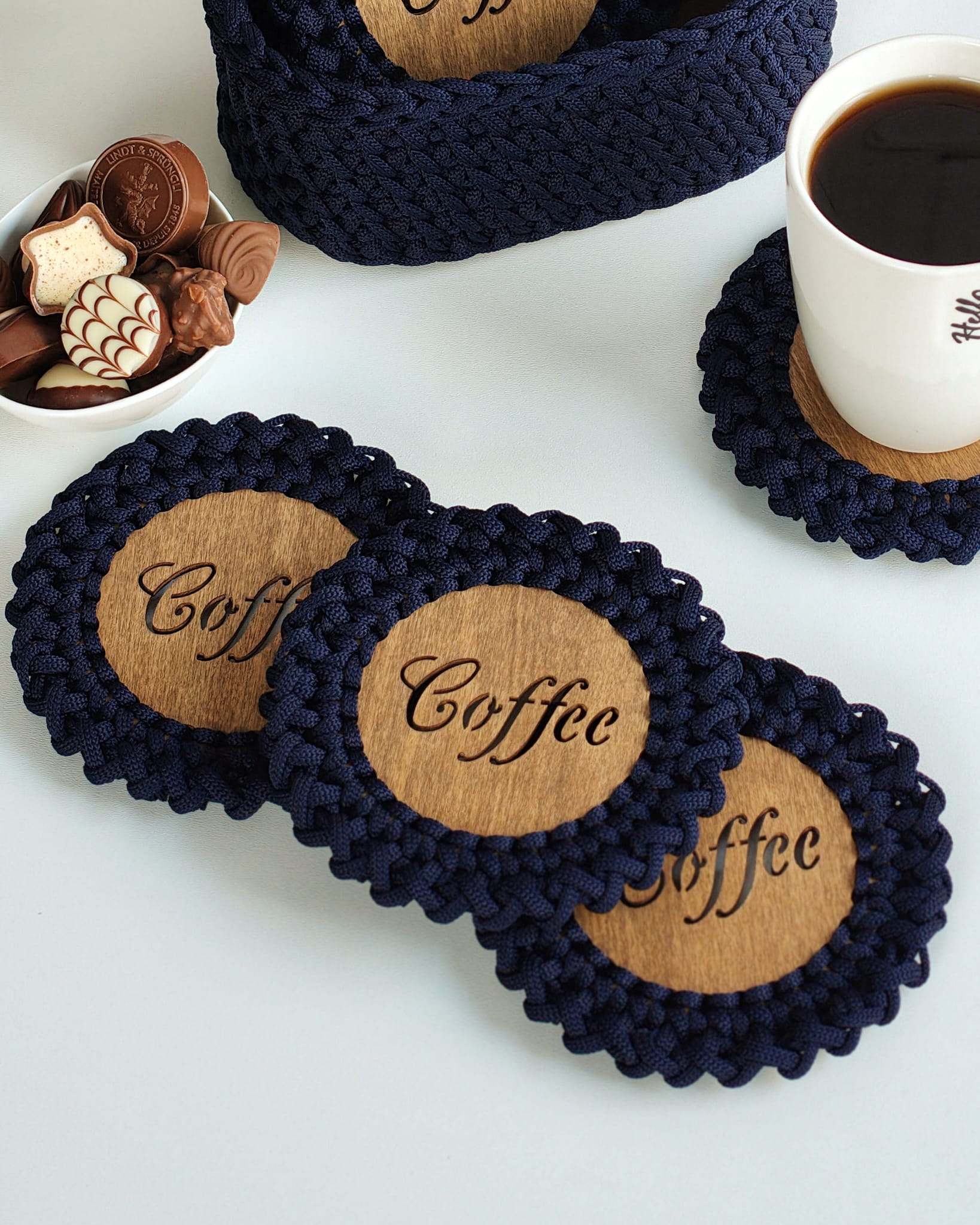 Stylowy zestaw podkładek pod kubek, który łączy funkcjonalność z eleganckim wyglądem. Podkładki wykonane są ręcznie ze sznurka poliestrowego, który nie chłonie płynów i jest wyjątkowo łatwy w czyszczeniu. Każda z nich posiada drewnianą, olejowaną bazę, chroniącą powierzchnie przed ciepłem i wilgocią.