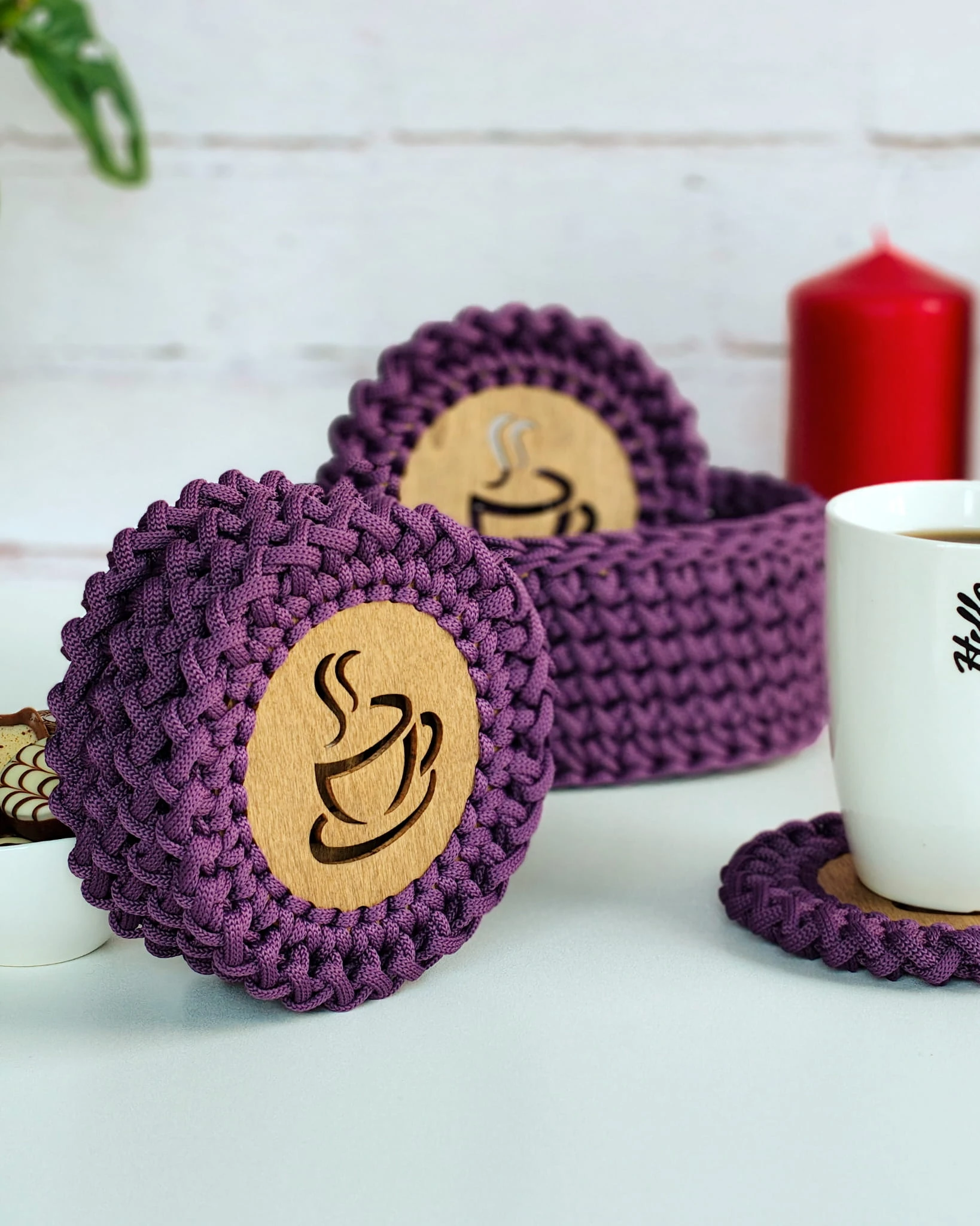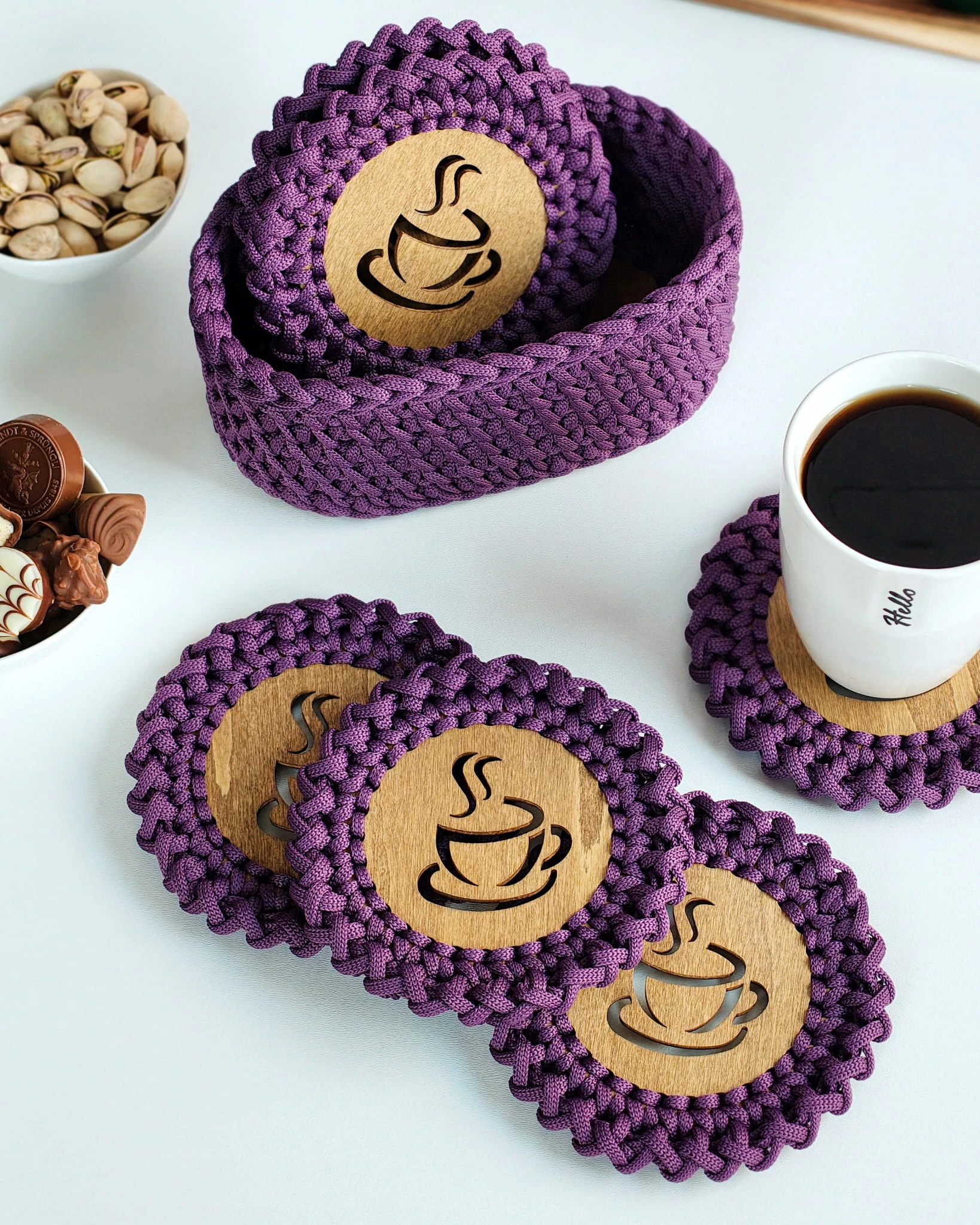 Ręcznie wykonany zestaw podkładek pod kubek ze sznurka poliestrowego na olejowanej, drewnianej bazie. W komplecie 6 podkładek oraz dopasowany koszyk/holder. Trwałe, odporne na wilgoć i łatwe w czyszczeniu – idealne do kawy i herbaty.