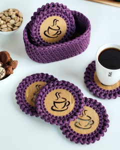 Stylowy zestaw podkładek pod kubek, który łączy funkcjonalność z eleganckim wyglądem. Podkładki wykonane są ręcznie ze sznurka poliestrowego, który nie chłonie płynów i jest wyjątkowo łatwy w czyszczeniu. Każda z nich posiada drewnianą, olejowaną bazę, chroniącą powierzchnie przed ciepłem i wilgocią.