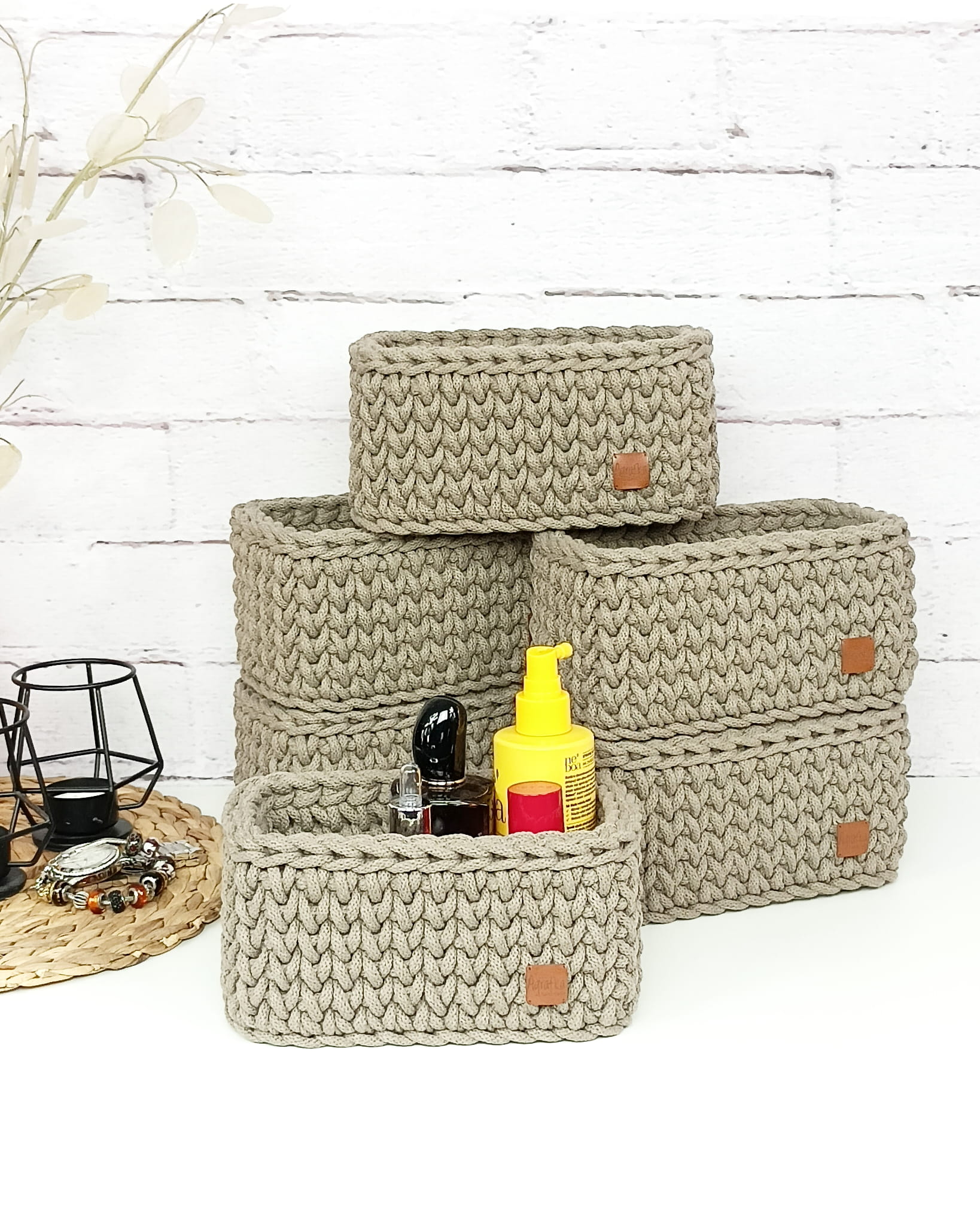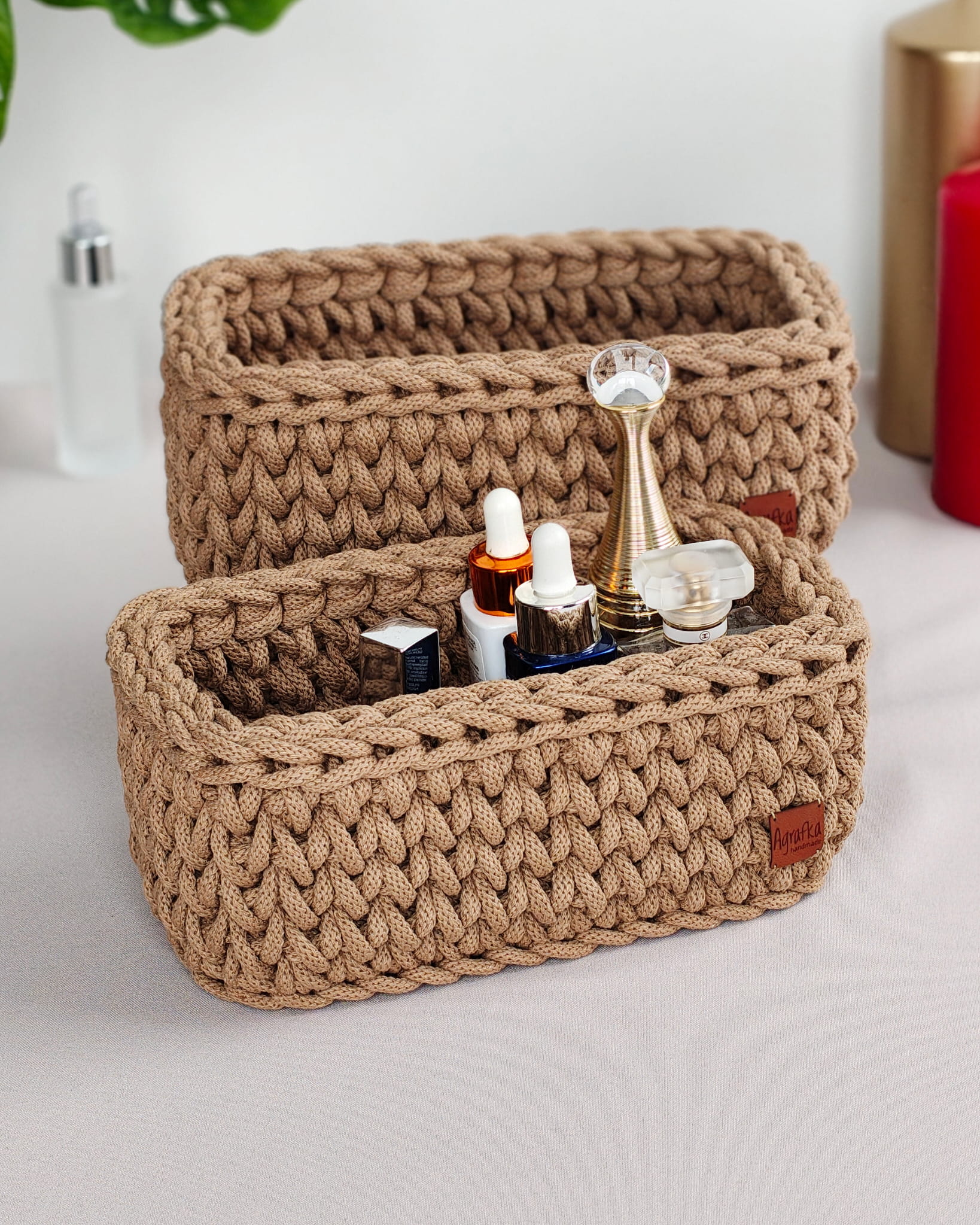 Ręcznie wykonany prostokątny koszyk szydełkowy z wysokiej jakości sznurka bawełnianego. Idealny do przechowywania kosmetyków, drobiazgów i akcesoriów. Stylowy dodatek do każdego wnętrza.