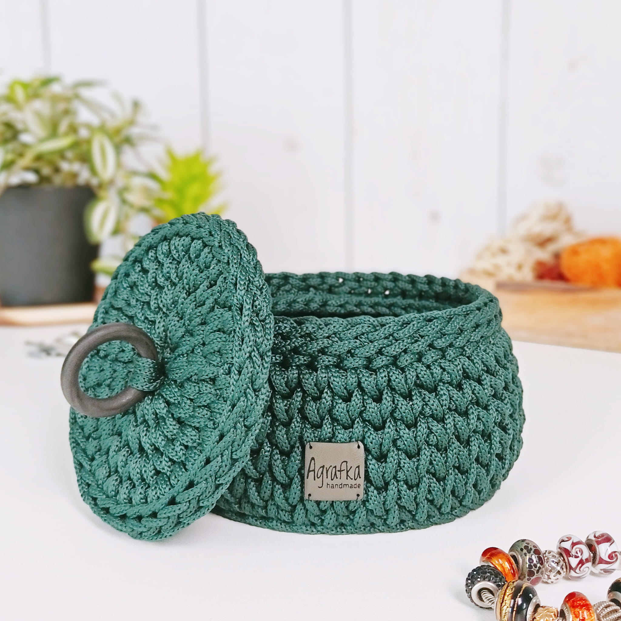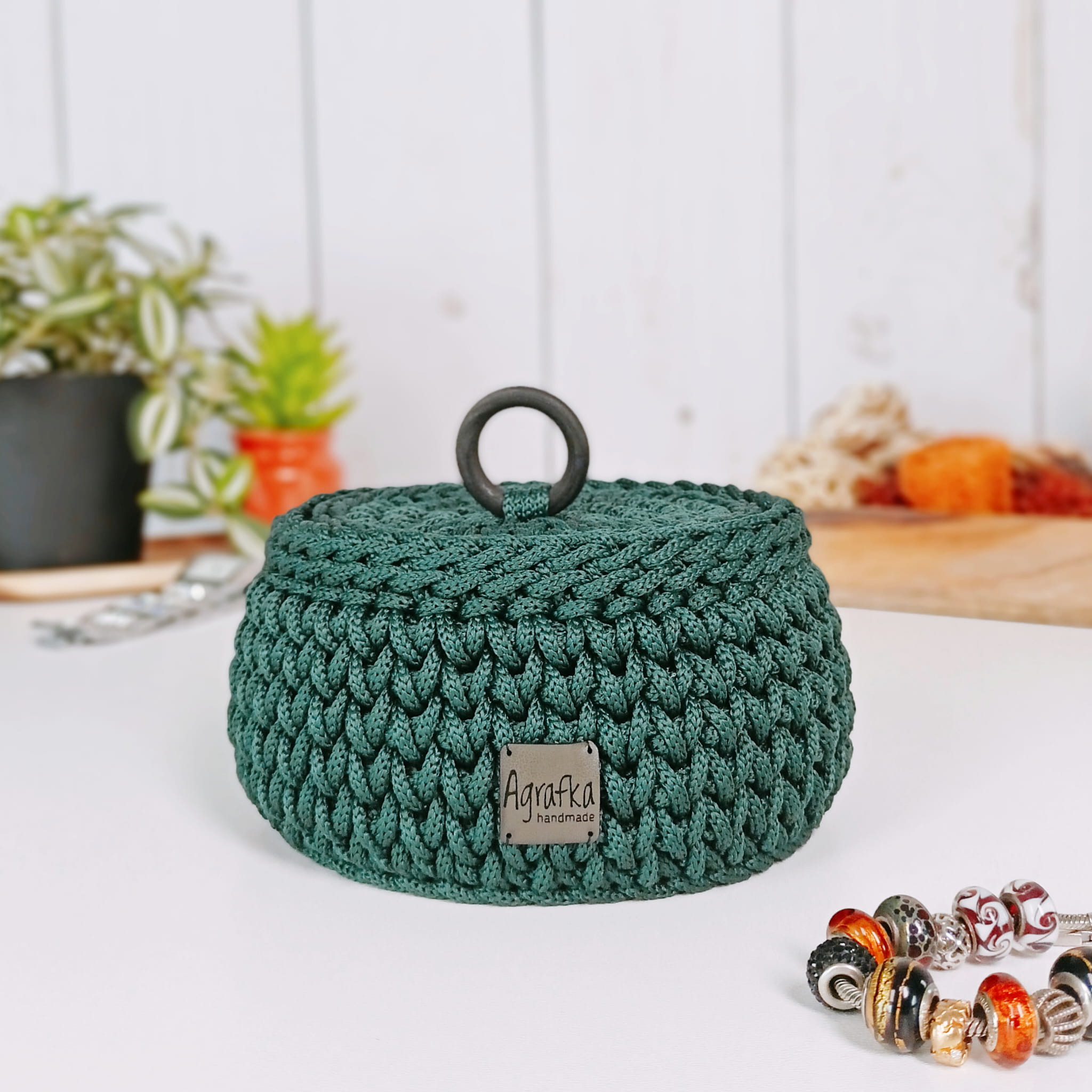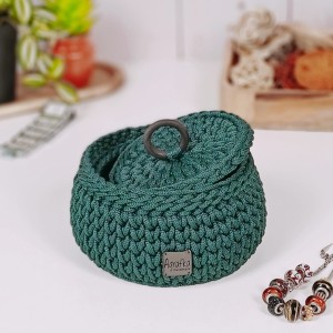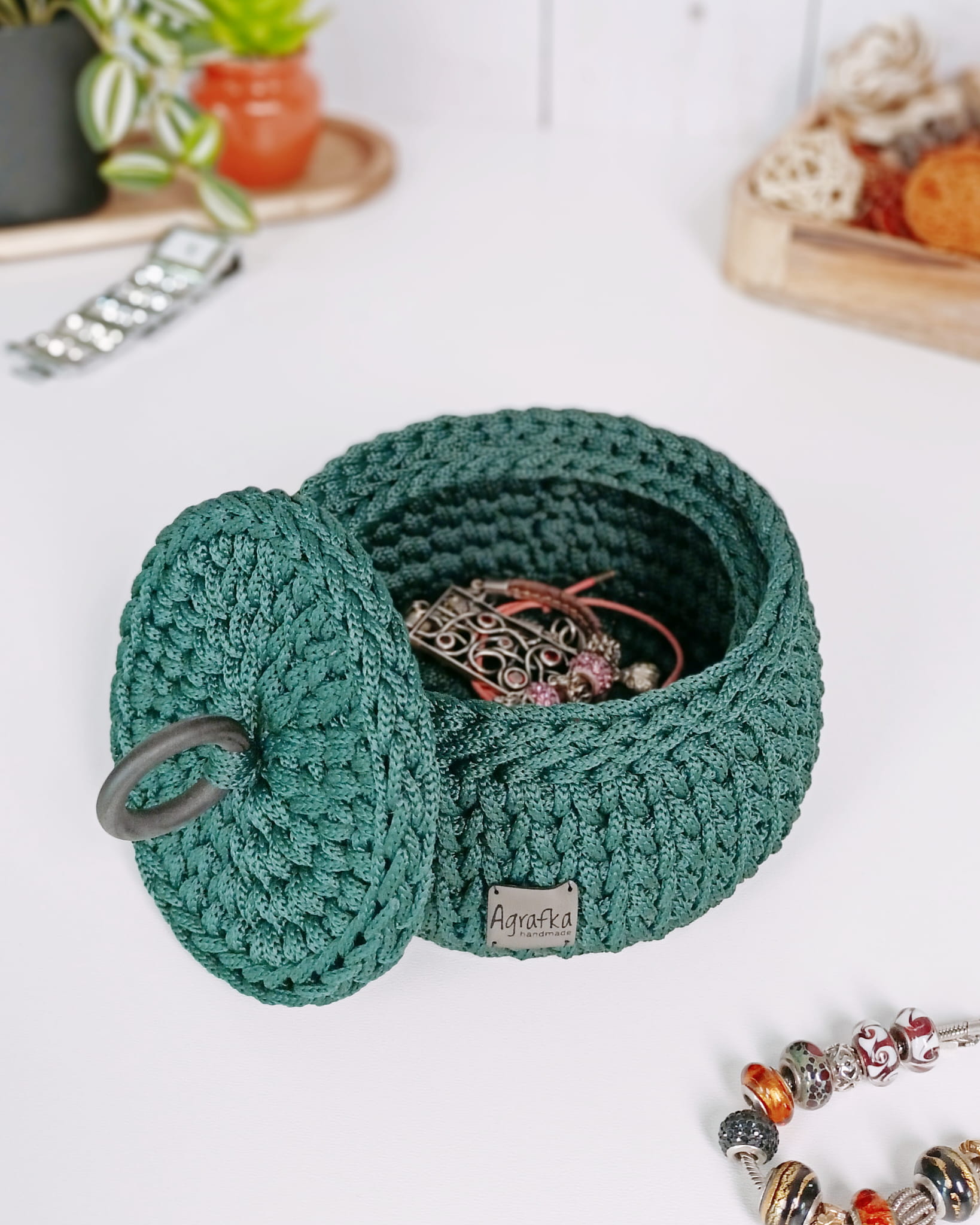 Stylowa i praktyczna szkatułka na biżuterię wykonana ręcznie ze sznurka poliestrowego. Okrągły kształt oraz dopasowana pokrywa sprawiają, że koszyk jest nie tylko funkcjonalny, ale również stanowi elegancki element dekoracyjny.