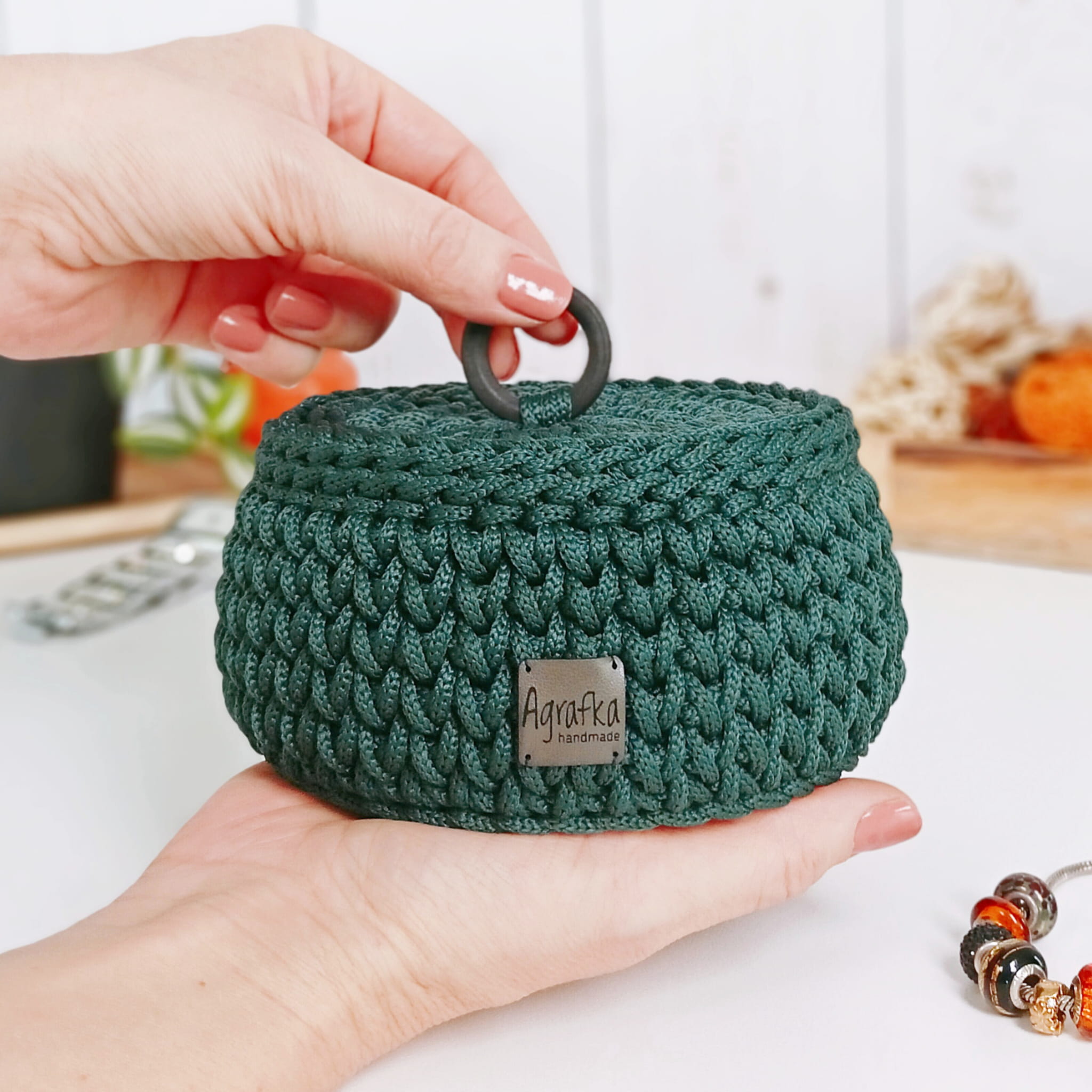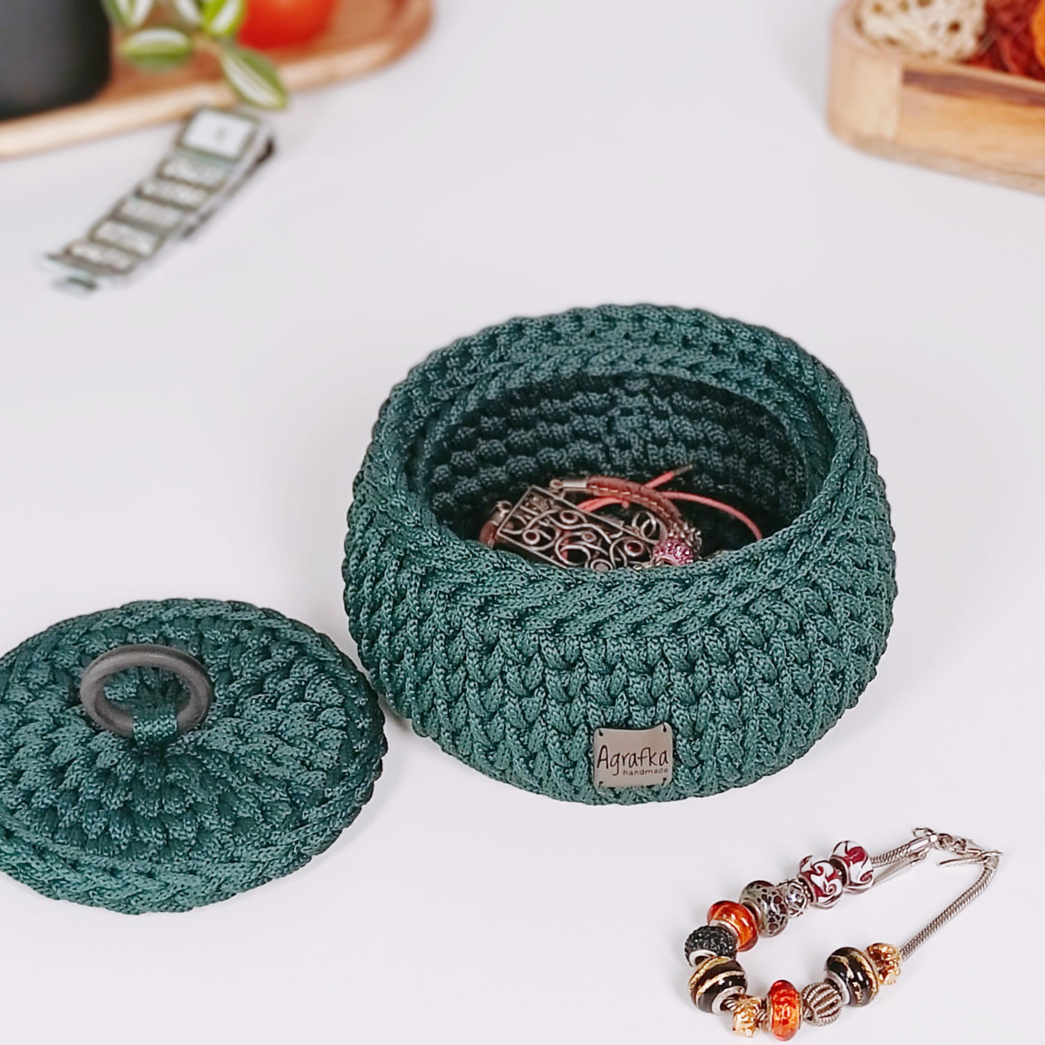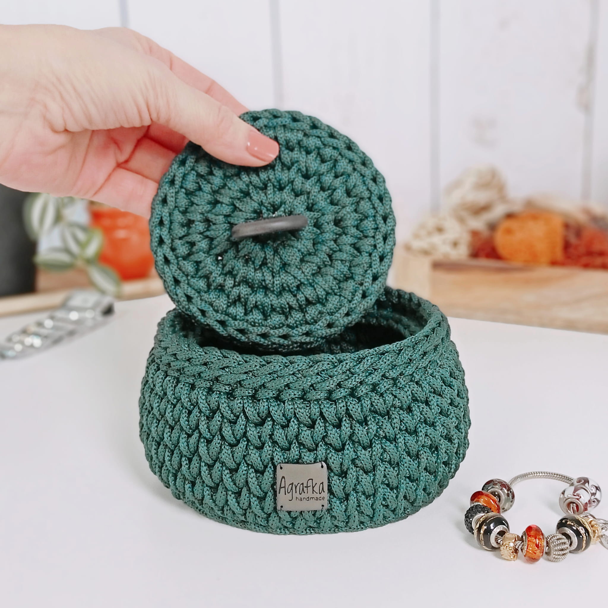 Ręcznie wykonana szkatułka na biżuterię ze sznurka poliestrowego z pokrywą. Idealna do przechowywania pierścionków, kolczyków i drobnych dodatków.