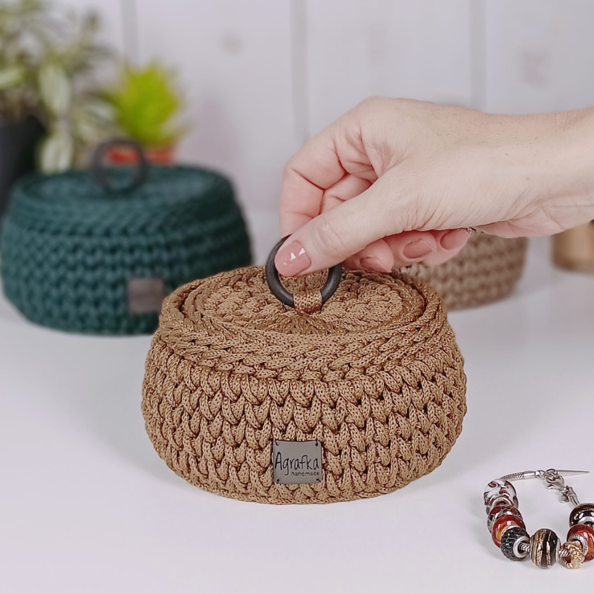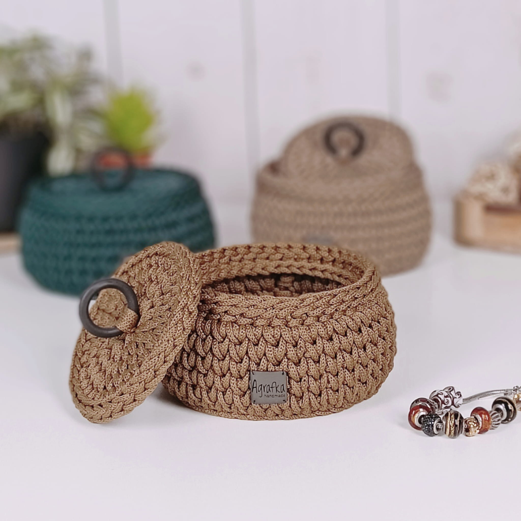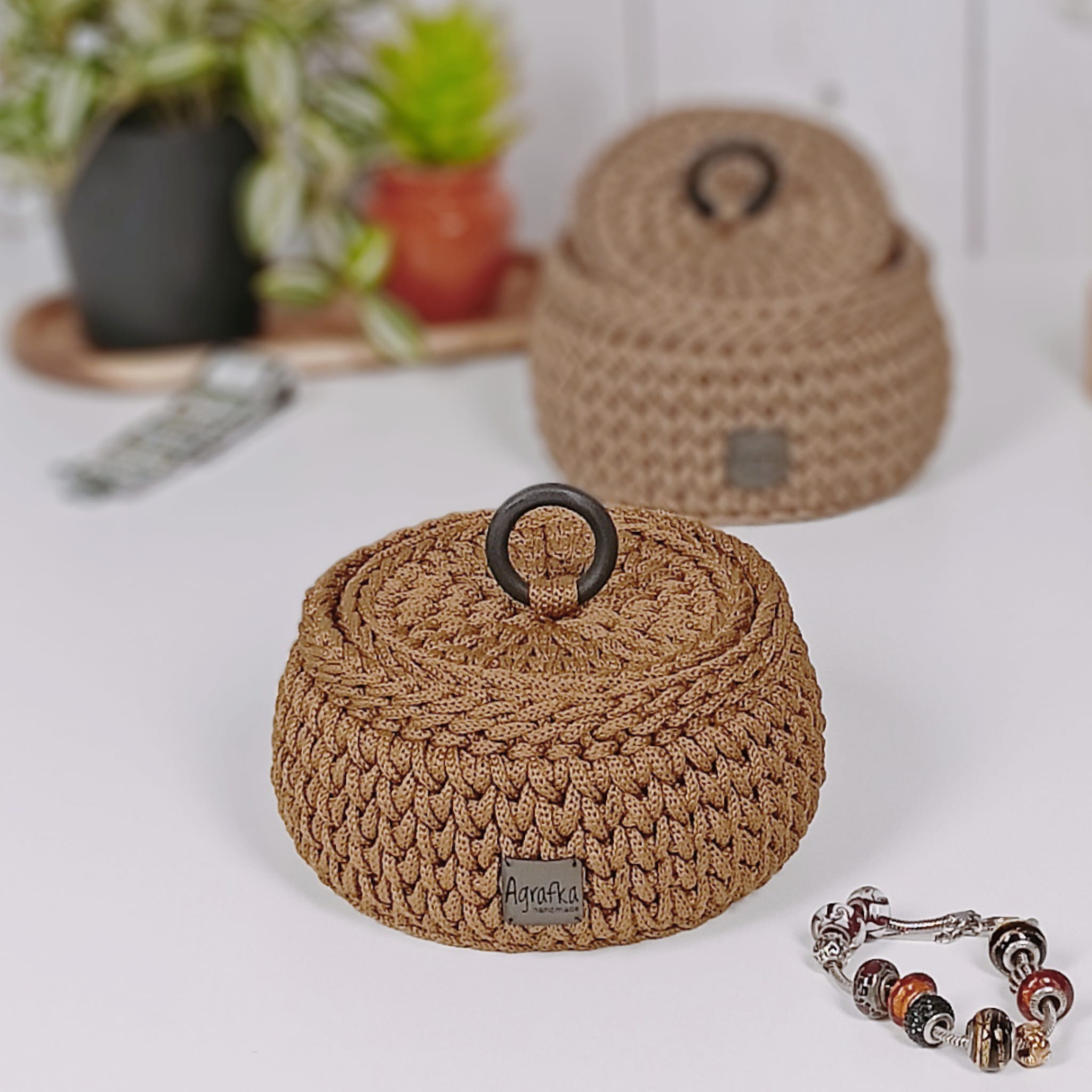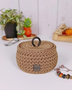 Stylowa i praktyczna szkatułka na biżuterię wykonana ręcznie ze sznurka poliestrowego. Okrągły kształt oraz dopasowana pokrywa sprawiają, że koszyk jest nie tylko funkcjonalny, ale również stanowi elegancki element dekoracyjny.