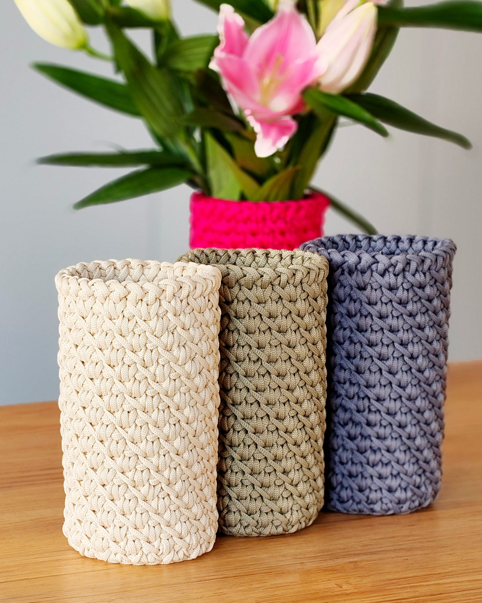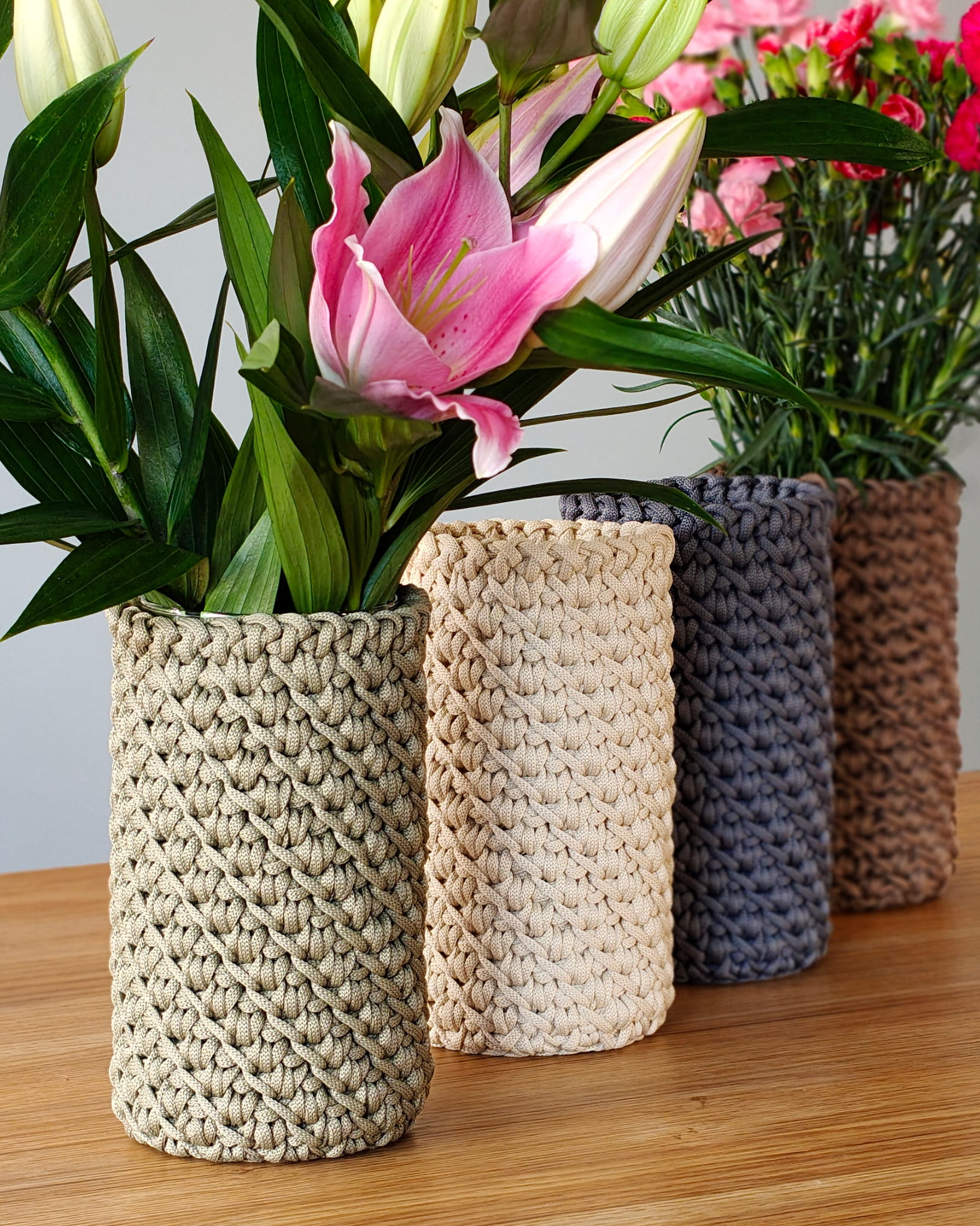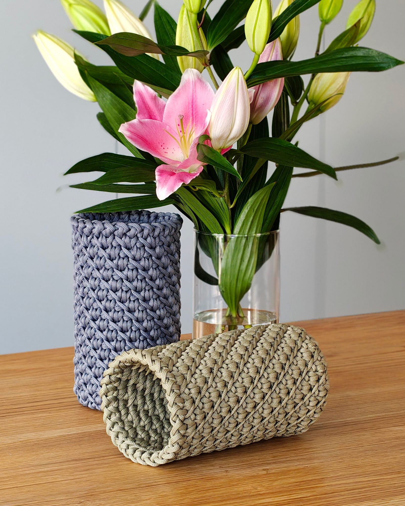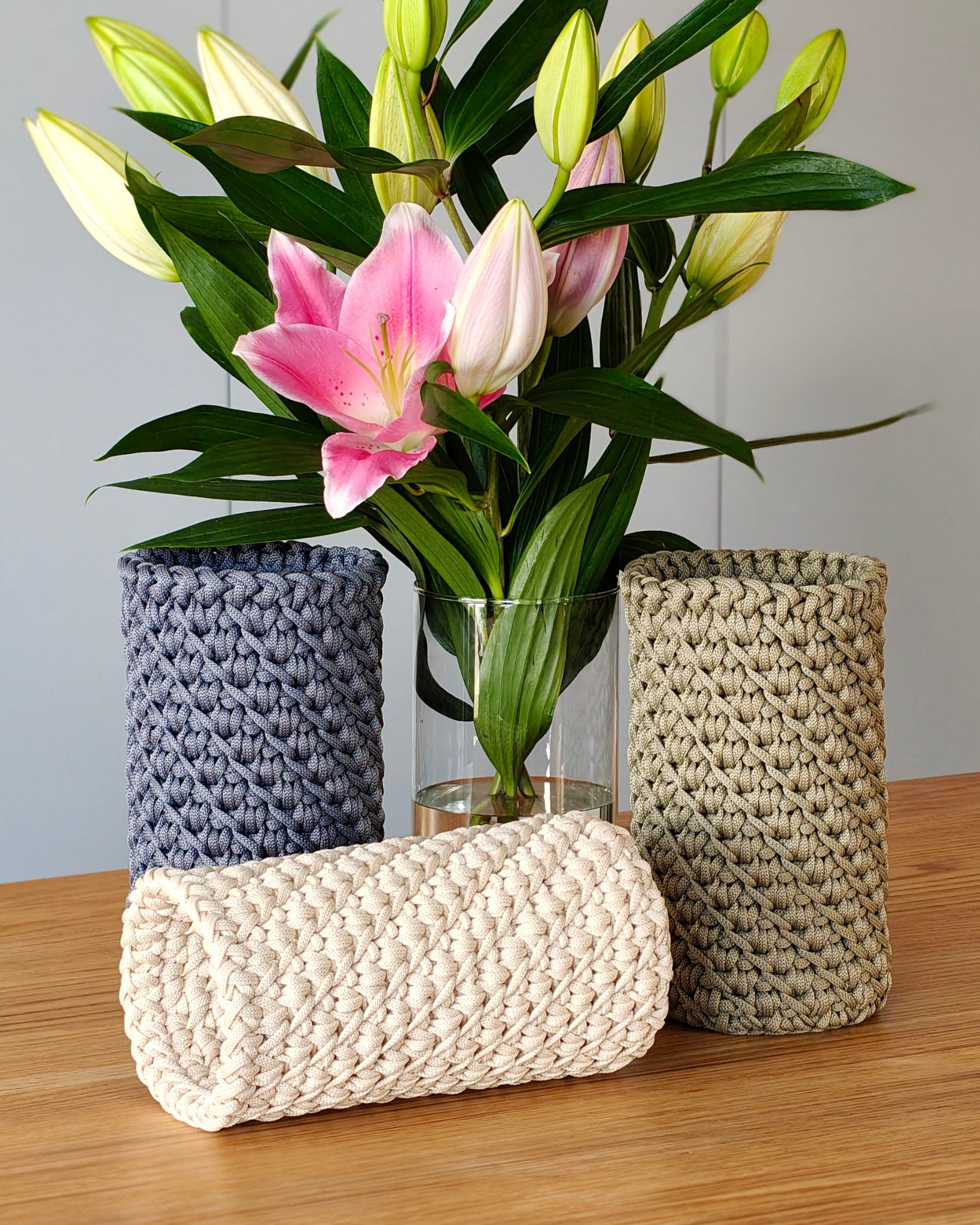 Pokrowiec powstaje ręcznie ze sznurka poliestrowego, który jest trwały i odporny na codzienne użytkowanie. Materiał nie chłonie wody, dlatego świetnie sprawdza się również przy świeżych kwiatach.