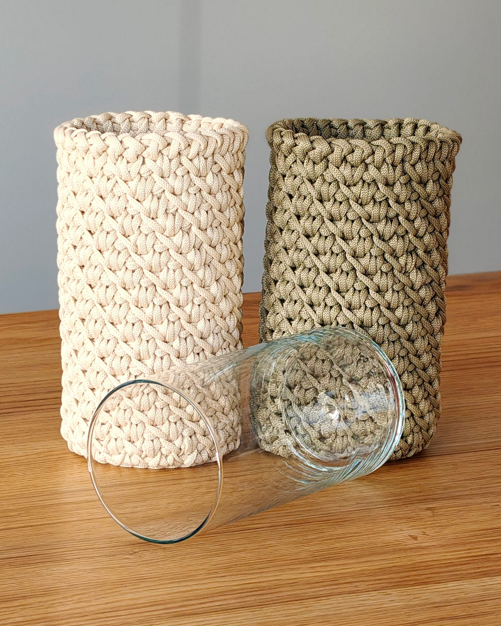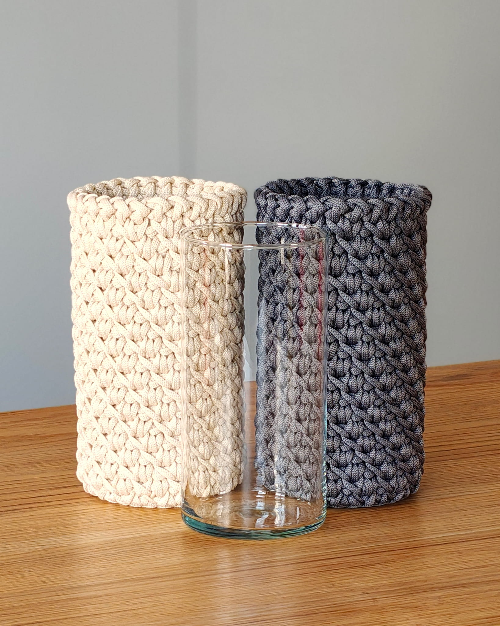Szydełkowy pokrowiec to dekoracyjny dodatek, który całkowicie zmienia charakter zwykłego szklanego wazonu. Miękka, pleciona struktura dodaje wnętrzu przytulności i naturalnego stylu.