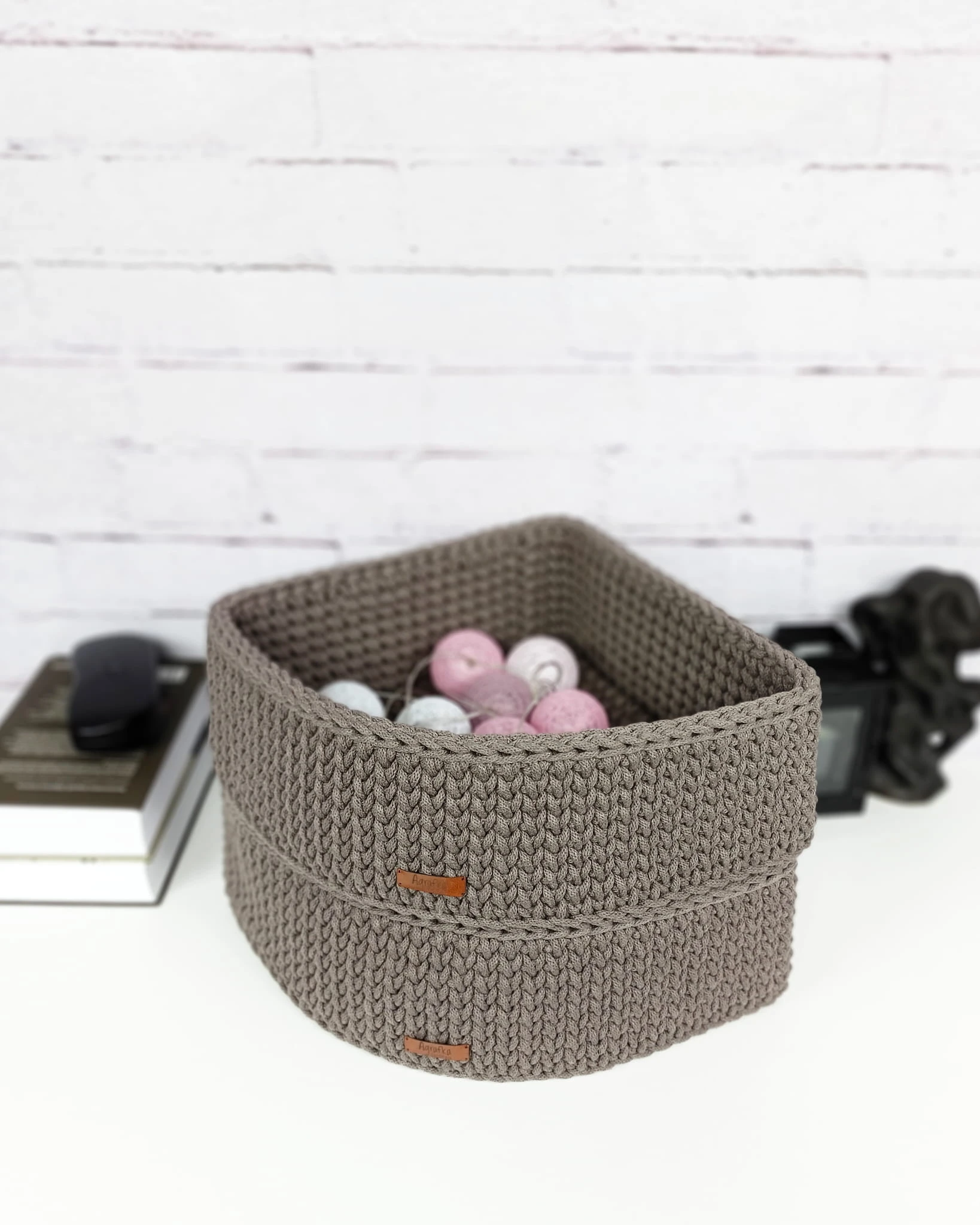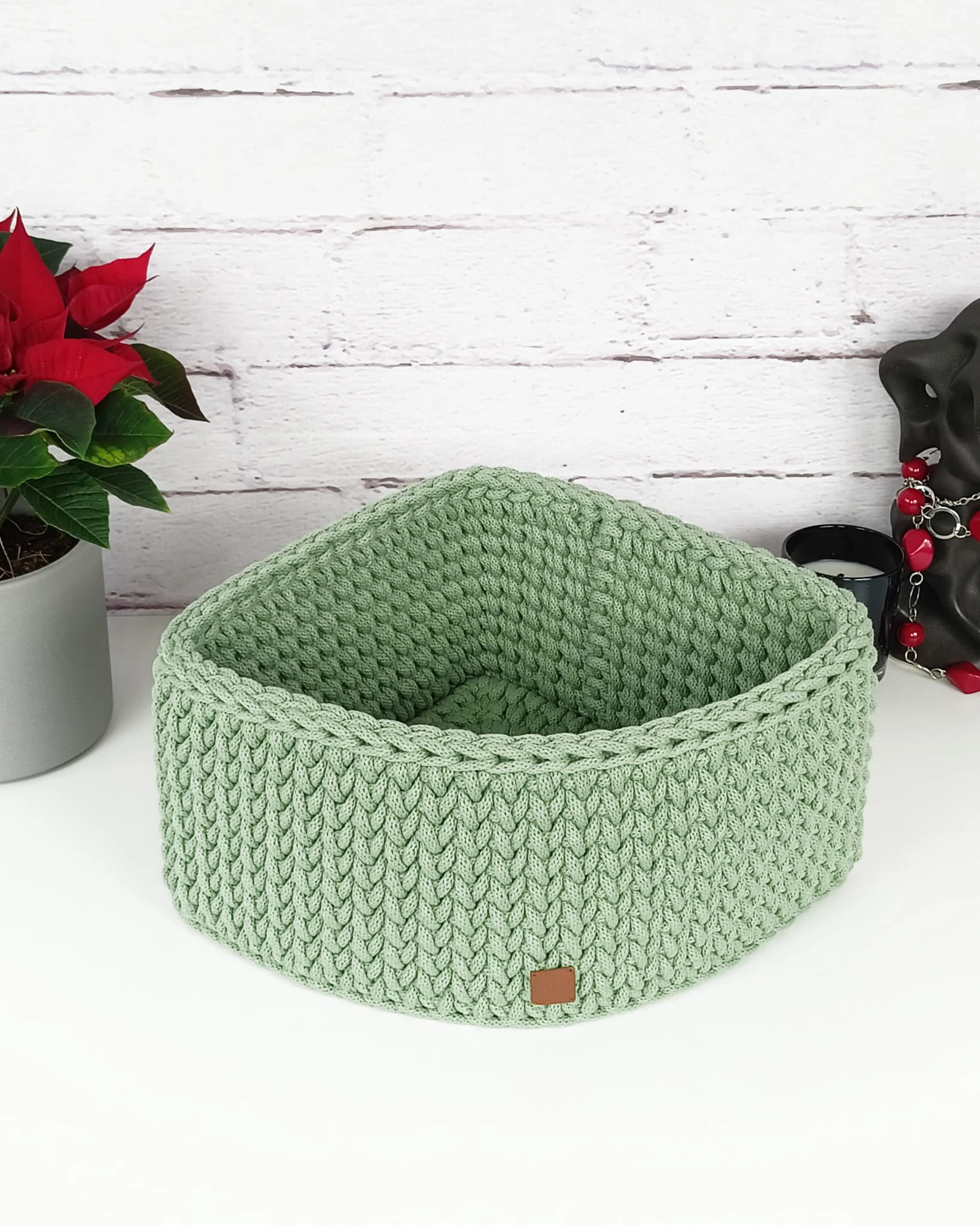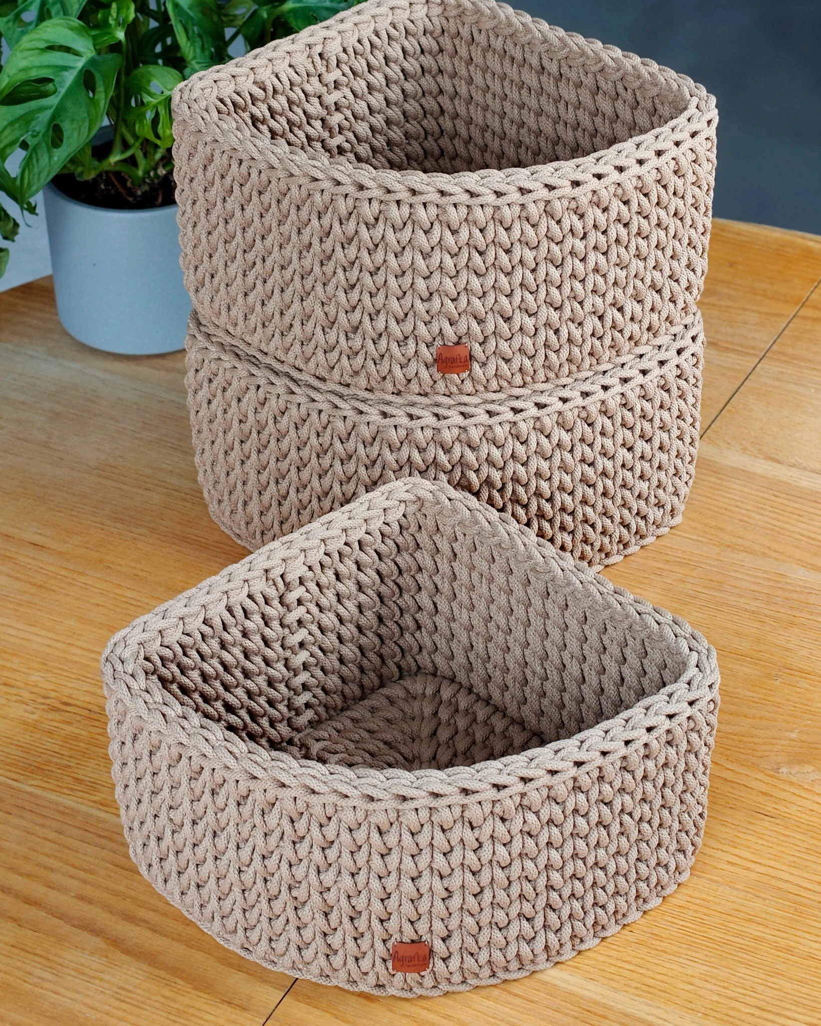 Ręcznie wykonany trójkątny koszyk ze sznurka bawełnianego to praktyczne i dekoracyjne rozwiązanie do przechowywania drobiazgów w każdym wnętrzu. Dostępny w różnych rozmiarach i szerokiej gamie kolorów – idealny do organizacji przestrzeni w stylu naturalnym i nowoczesnym.