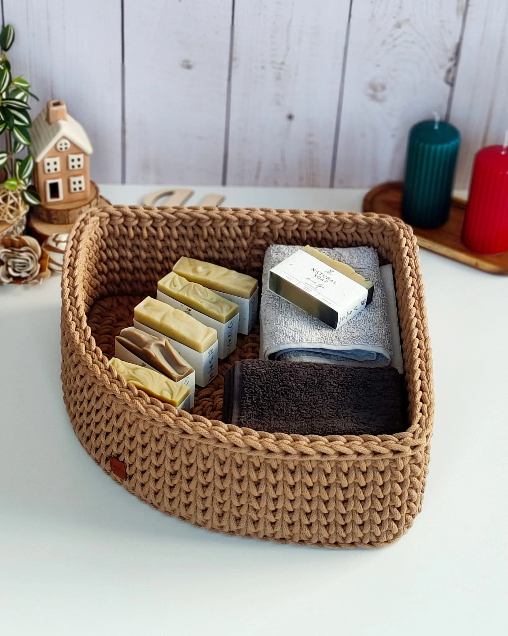 Ten wyjątkowy koszyk trójkątny został w całości wykonany ręcznie z wysokiej jakości sznurka bawełnianego, co zapewnia mu trwałość, stabilność i estetyczny wygląd na długie lata. Jego oryginalny kształt sprawia, że doskonale prezentuje się zarówno na półce, komodzie, jak i w łazience czy pokoju dziecięcym.