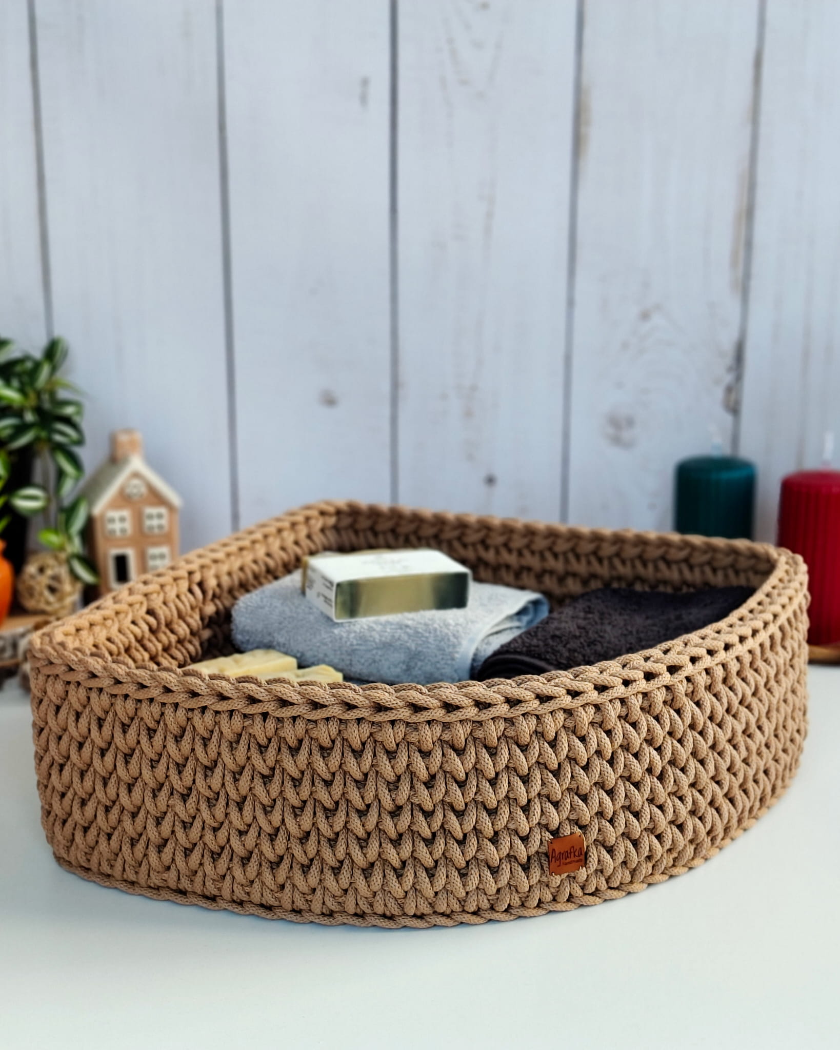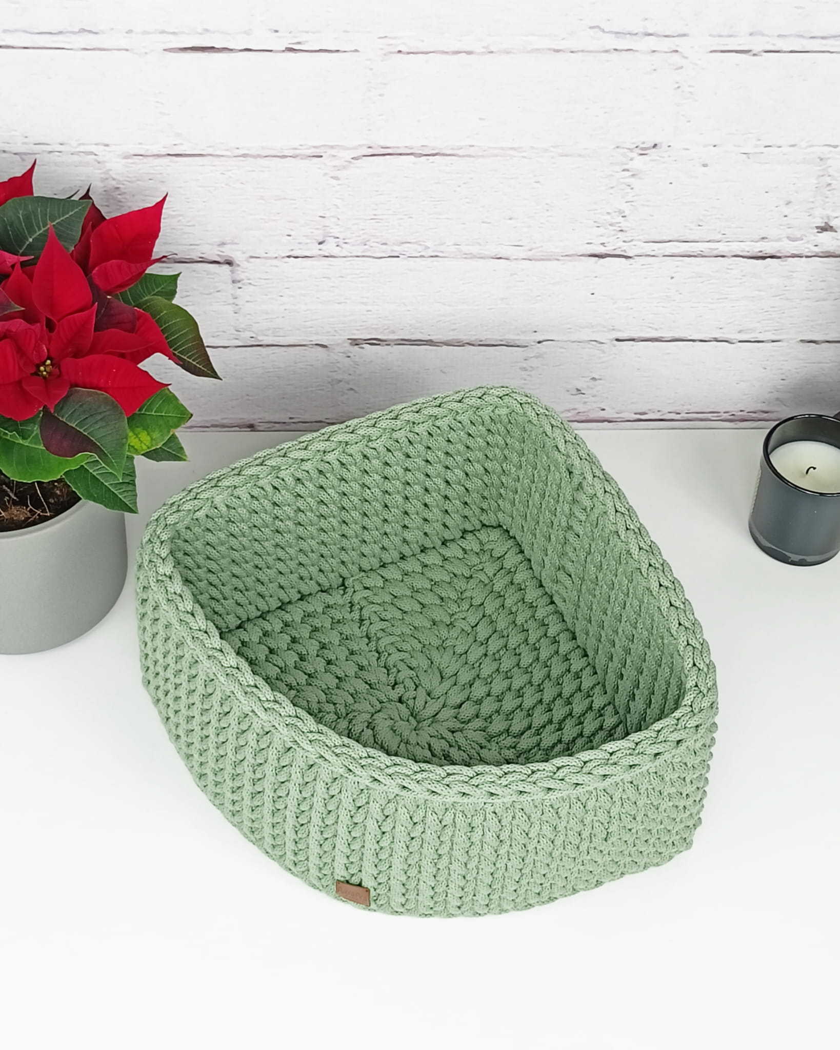 Ręcznie wykonany trójkątny koszyk ze sznurka bawełnianego to praktyczne i dekoracyjne rozwiązanie do przechowywania drobiazgów w każdym wnętrzu. Dostępny w różnych rozmiarach i szerokiej gamie kolorów – idealny do organizacji przestrzeni w stylu naturalnym i nowoczesnym.