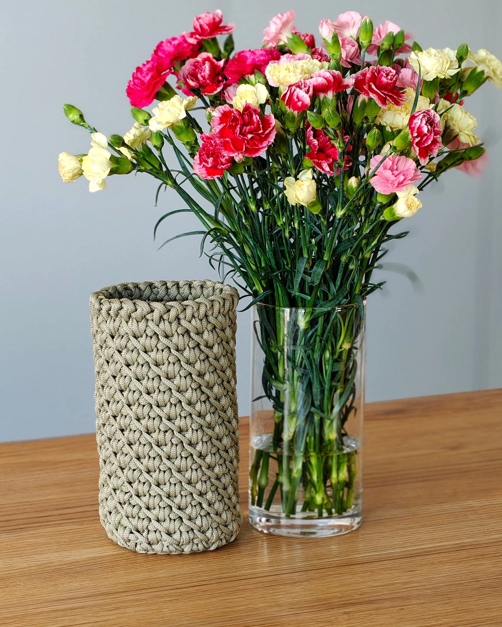 Pokrowiec powstaje ręcznie ze sznurka poliestrowego. Materiał jest trwały, nie chłonie wody i można go bez problemu prać, dzięki czemu wazon pozostaje praktyczny w codziennym użytkowaniu.