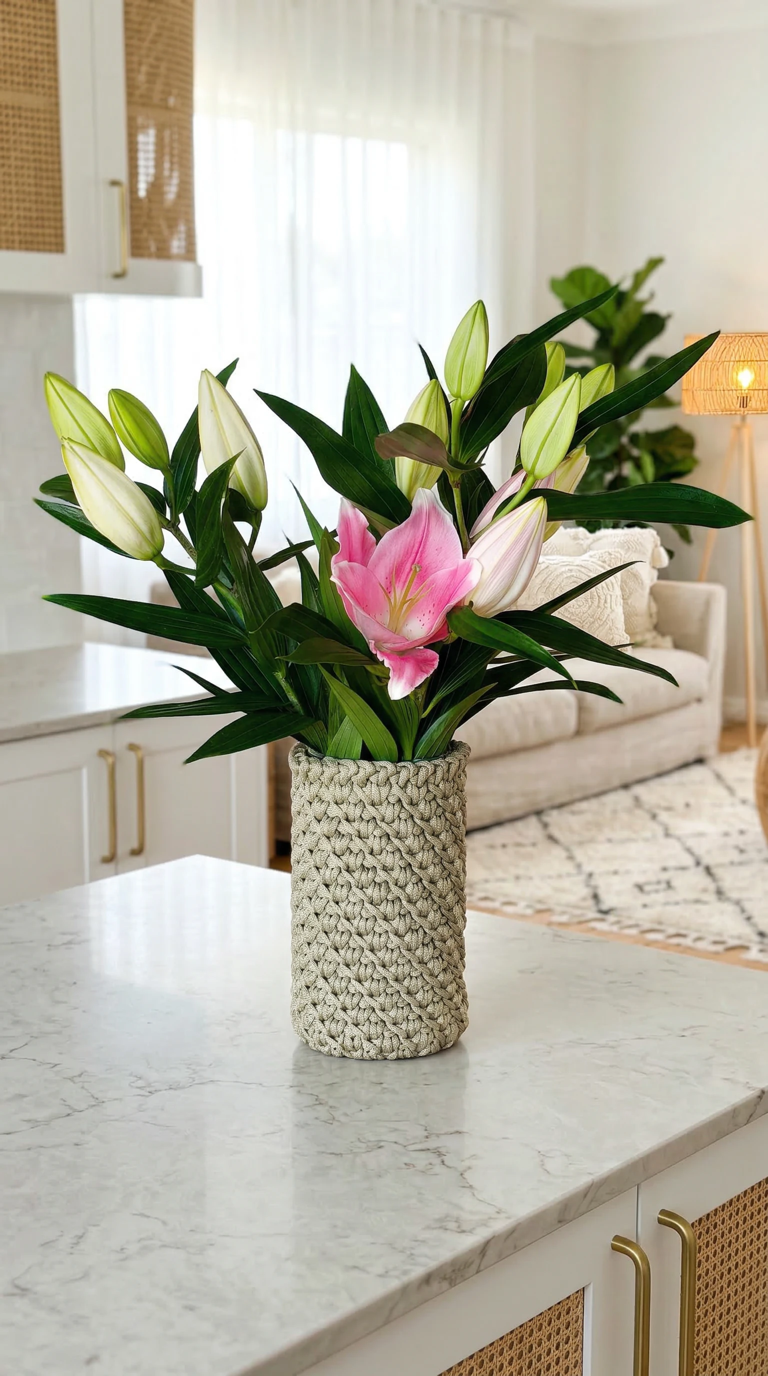 Ten wazon to połączenie prostoty szkła i rękodzielniczej struktury szydełkowego pokrowca.