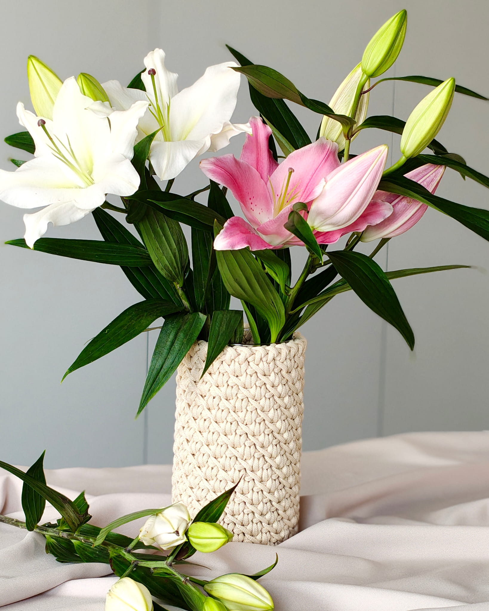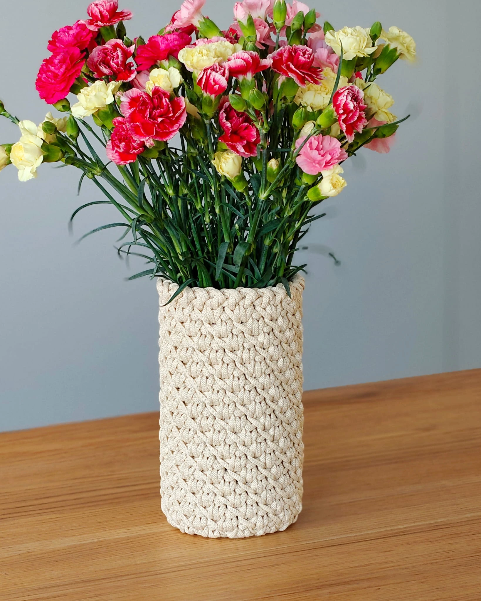 Pokrowiec powstaje ręcznie ze sznurka poliestrowego. Materiał jest trwały, nie chłonie wody i można go bez problemu prać, dzięki czemu wazon pozostaje praktyczny w codziennym użytkowaniu.