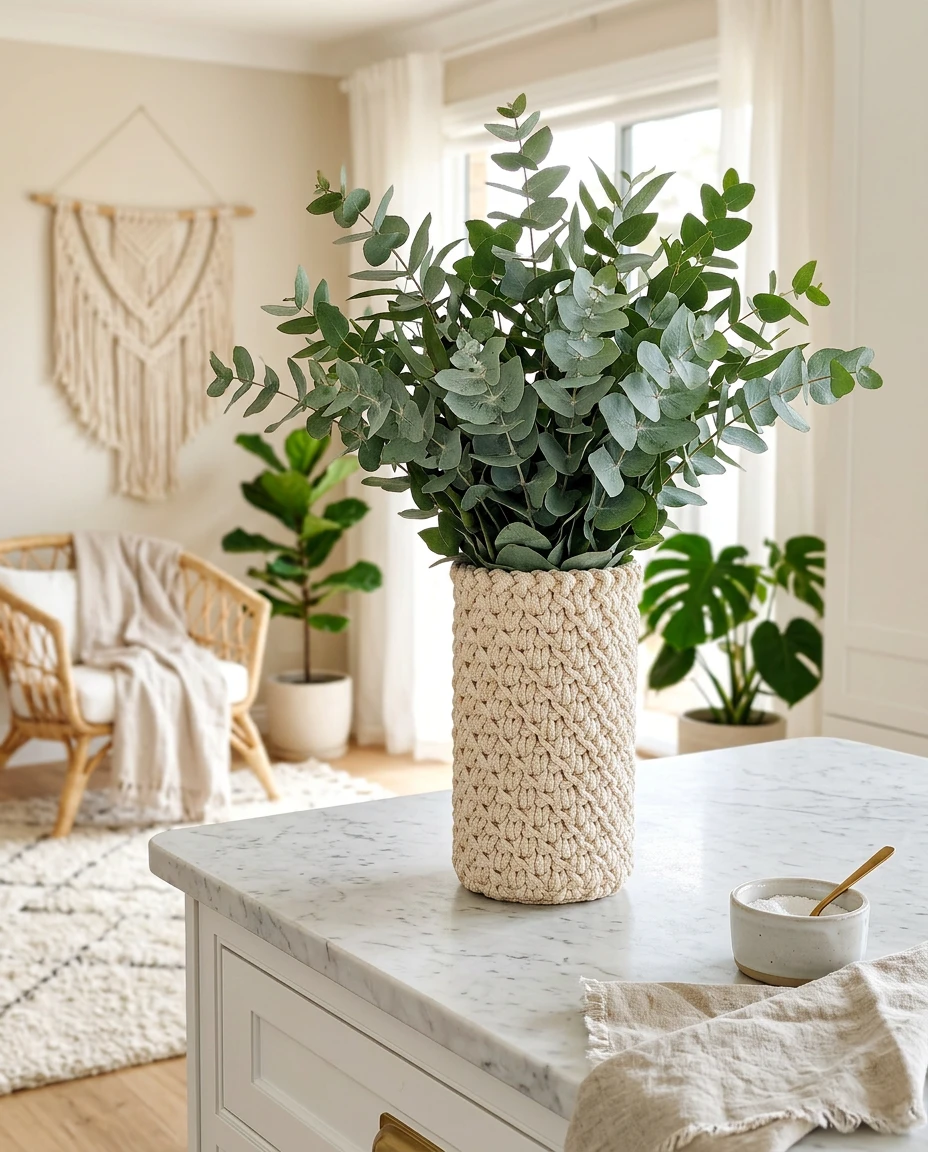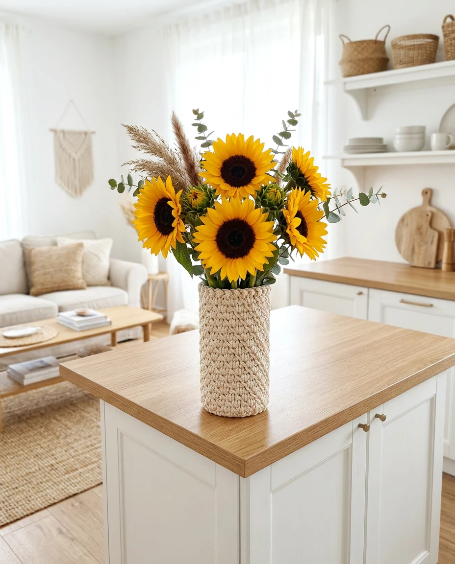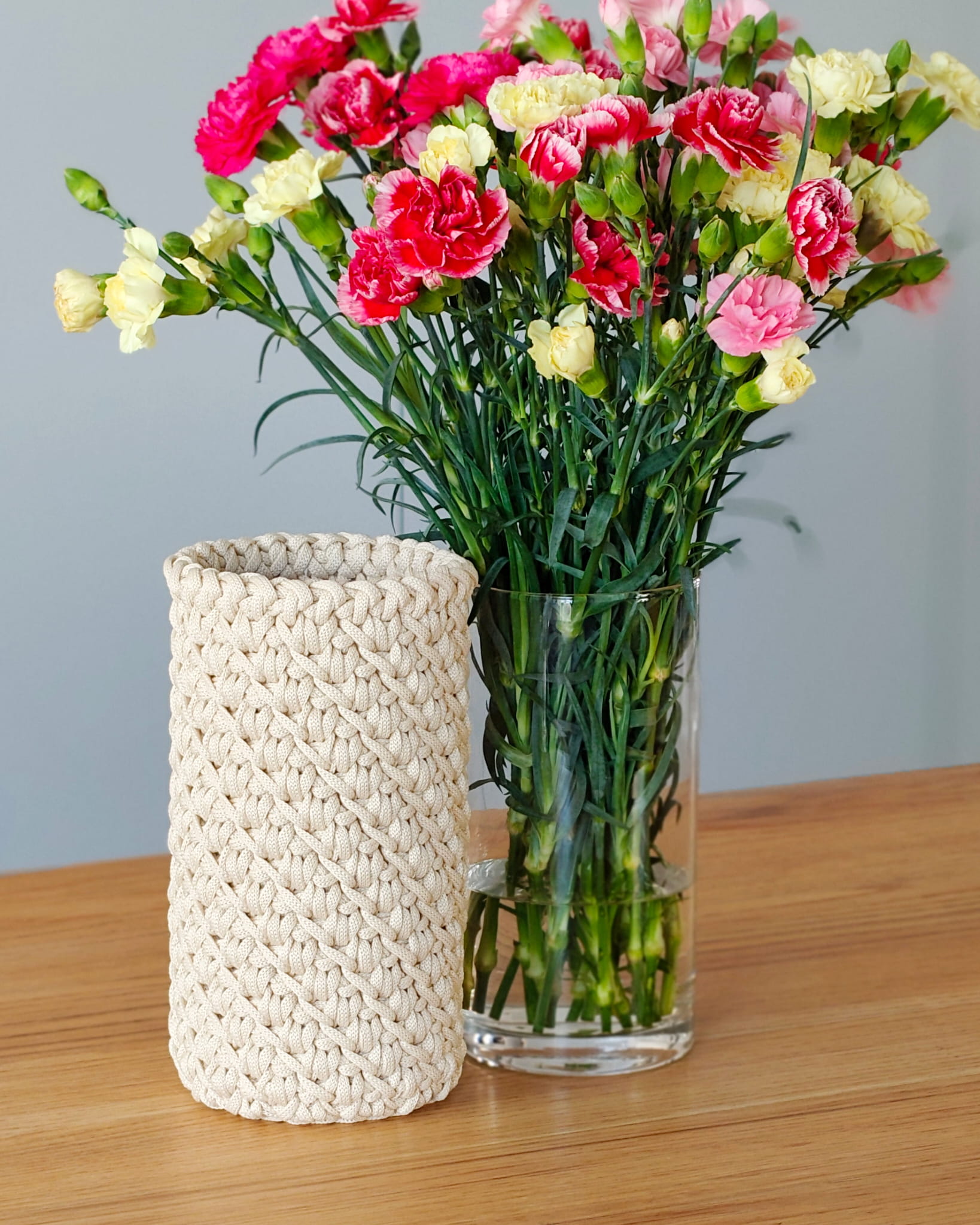 Ten wazon to połączenie prostoty szkła i rękodzielniczej struktury szydełkowego pokrowca.