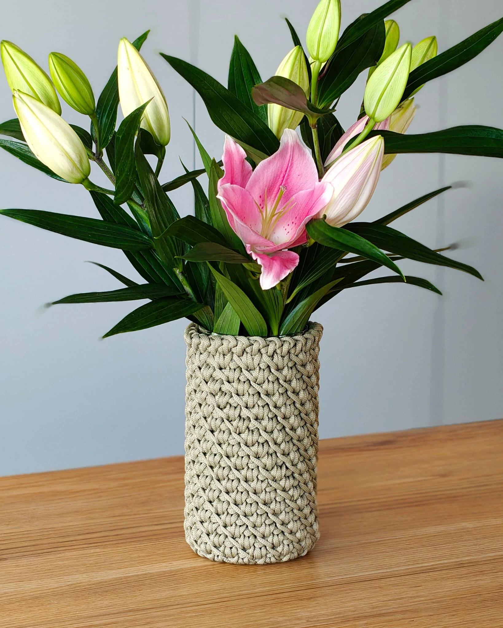 Pokrowiec powstaje ręcznie ze sznurka poliestrowego. Materiał jest trwały, nie chłonie wody i można go bez problemu prać, dzięki czemu wazon pozostaje praktyczny w codziennym użytkowaniu.