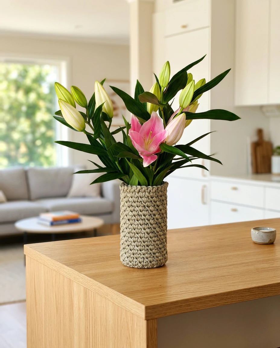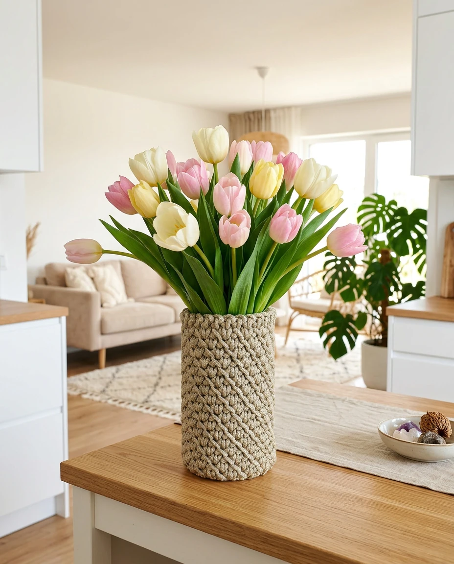 Ten wazon to połączenie prostoty szkła i rękodzielniczej struktury szydełkowego pokrowca.