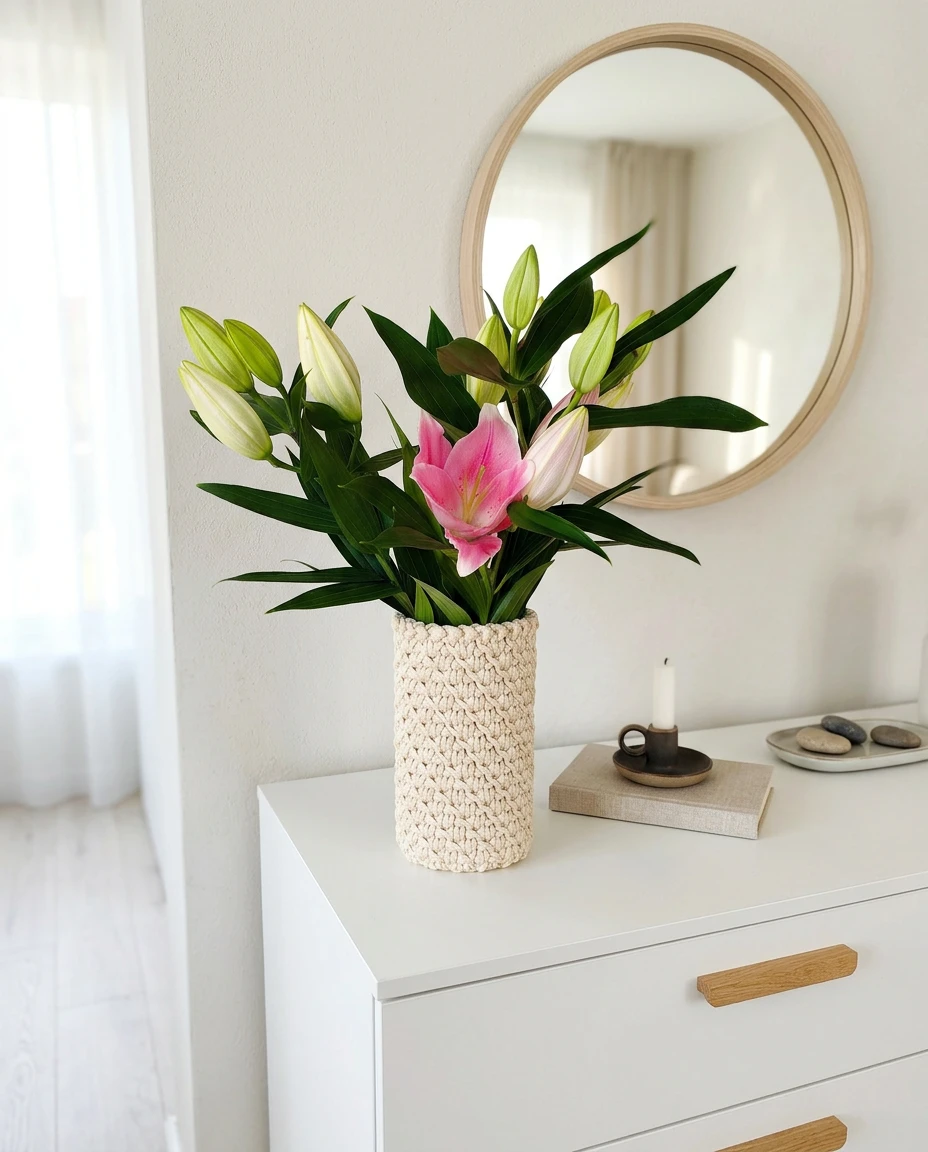 Ten wazon to połączenie prostoty szkła i rękodzielniczej struktury szydełkowego pokrowca.